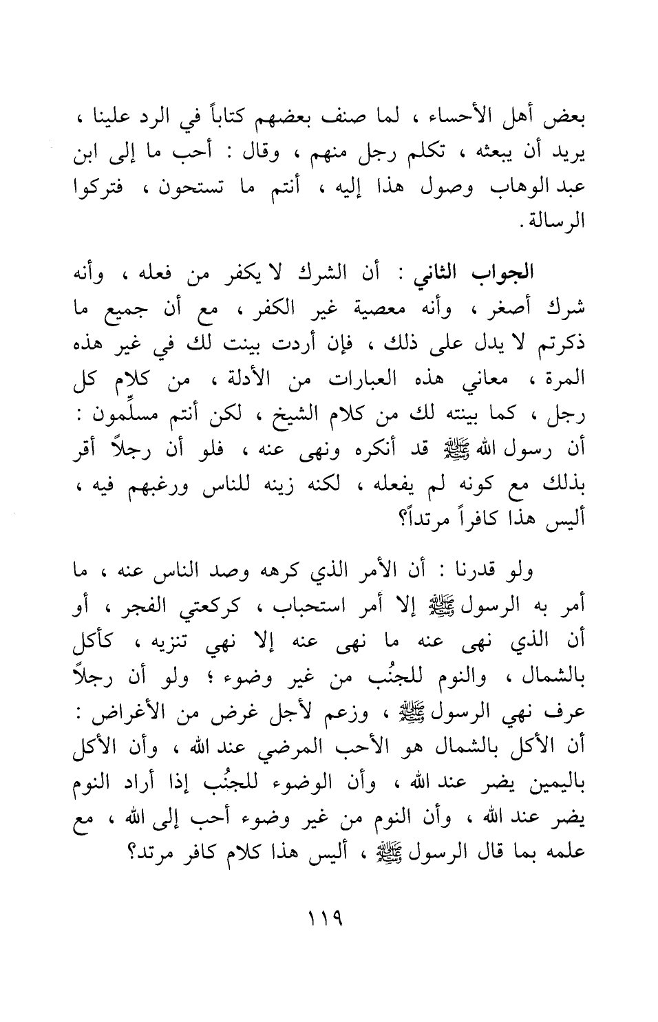 الجواب الثاني: أن الشرك لا يكفر من فعله، وأنه شرك أصغر، وأنه معصية غير الكفر، مع أن جميع ما ذكرتم لا يدل على ذلك، فإن أردت بينت لك في غير هذه المرة، معاني هذه العبارات من الأدلة، من كلام كل رجل، كما بينته لك من كلام الشيخ، لكن أنتم مسلِّمون: أن رسول الله صلى الله عليه وسلم قد أنكره ونهى عنه، فلو أن رجلا أقر بذلك مع كونه لم يفعله، لكنه زينه للناس ورغبهم فيه، أليس هذا كافرا مرتدا؟