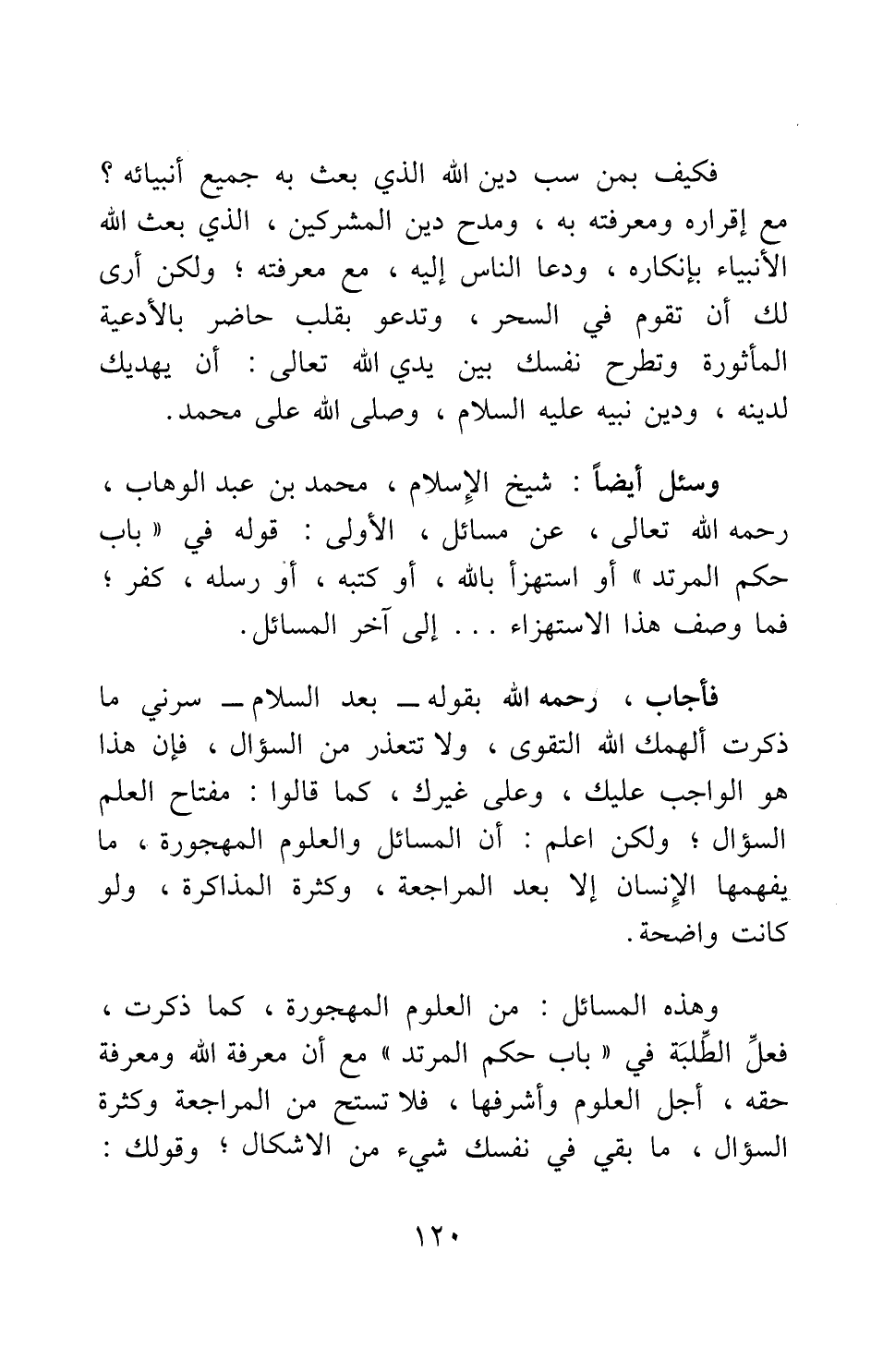 وهذه المسائل: من العلوم المهجورة، كما ذكرت، فعل الطلبَة في باب حكم المرتد، مع أن معرفة الله ومعرفة حقه، أجلّ العلوم وأشرفها، فلا تستح من المراجعة وكثرة السؤال، ما بقي في نفسك شيء من الإشكال، وقولك: