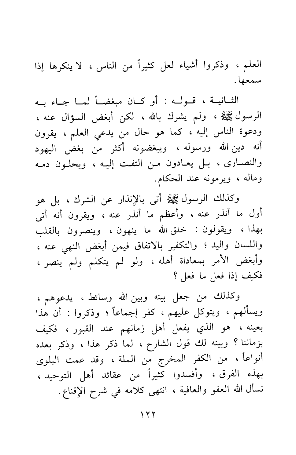 الثانية: قوله: أو كان مبغضا لما جاء به الرسول صلى الله عليه وسلم ولم يشرك بالله، لكن أبغض السؤال عنه، ودعوة الناس إليه، كما هو حال من يدعي العلم، يقرون أنه دين الله ورسوله، ويبغضونه أكثر من بغض اليهود والنصارى، بل يعادون من التفت إليه، ويحلون دمه وماله، ويرمونه عند الحكام.