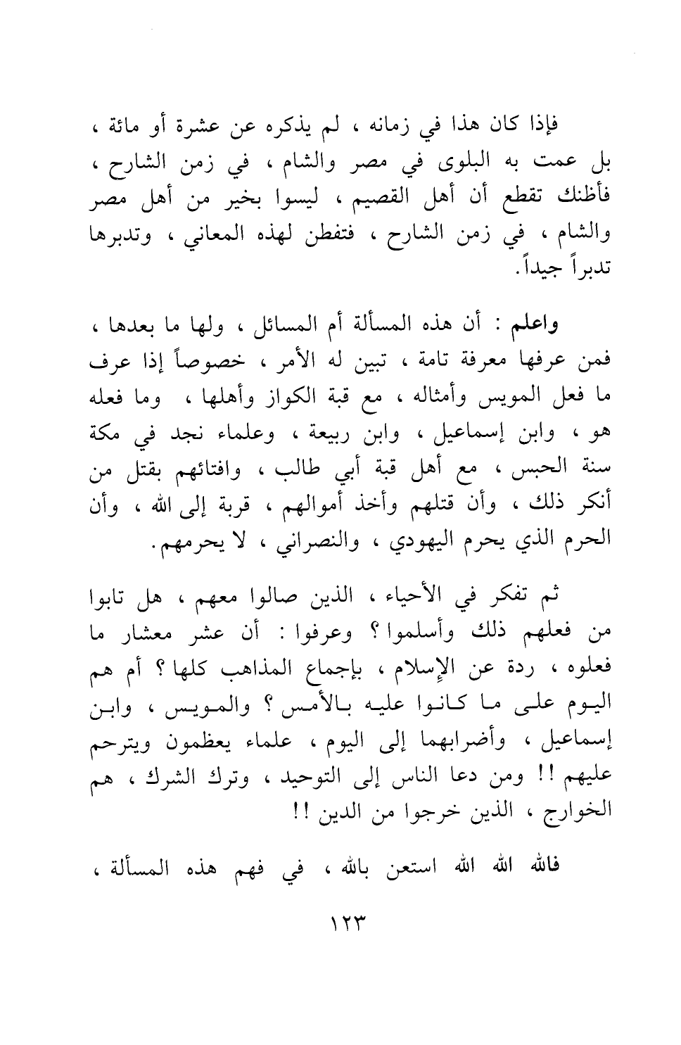 واعلم: أن هذه المسألة أم المسائل، ولها ما بعدها؛ فمن عرفها معرفة تامة، تبين له الأمر، خصوصا إذا عرف ما فعل المويس وأمثاله، مع قبة الكواز وأهلها، وما فعله هو، وابن إسماعيل، وابن ربيعة، وعلماء نجد في مكة سنة الحبس، مع أهل قبة أبي طالب، وإفتائهم بقتل من أنكر ذلك، وأن قتلهم وأخذ أموالهم، قربة إلى الله، وأن الحرم الذي يحرم اليهودي، والنصراني، لا يحرمهم.