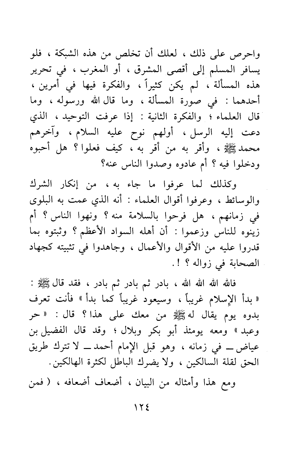 واحرص على ذلك، لعلك أن تخلص من هذه الشبكة؛ فلو يسافر المسلم إلى أقصى المشرق، أو المغرب، في تحرير هذه المسألة، لم يكن كثيرا؛ والفكرة فيها في أمرين: