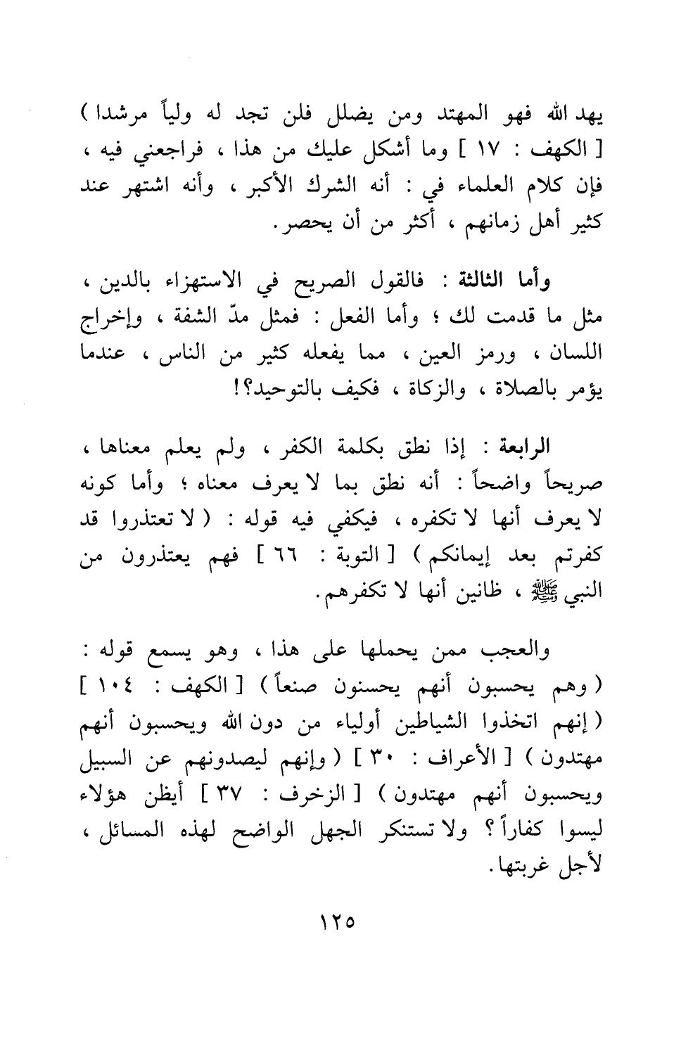 والعجب ممن يحملها على هذا، وهو يسمع قوله: {وَهُمْ يَحْسَبُونَ أَنَّهُمْ يُحْسِنُونَ صُنْعاً} 3، {إِنَّهُمُ اتَّخَذُوا الشَّيَاطِينَ أَوْلِيَاءَ مِنْ دُونِ اللَّهِ وَيَحْسَبُونَ أَنَّهُمْ مُهْتَدُونَ} 4، {وَإِنَّهُمْ لَيَصُدُّونَهُمْ عَنِ السَّبِيلِ وَيَحْسَبُونَ أَنَّهُمْ مُهْتَدُونَ} 5، أيظن هؤلاء ليسوا كفارا؟ ولا تستنكر الجهل الواضح لهذه المسائل، لأجل غربتها.