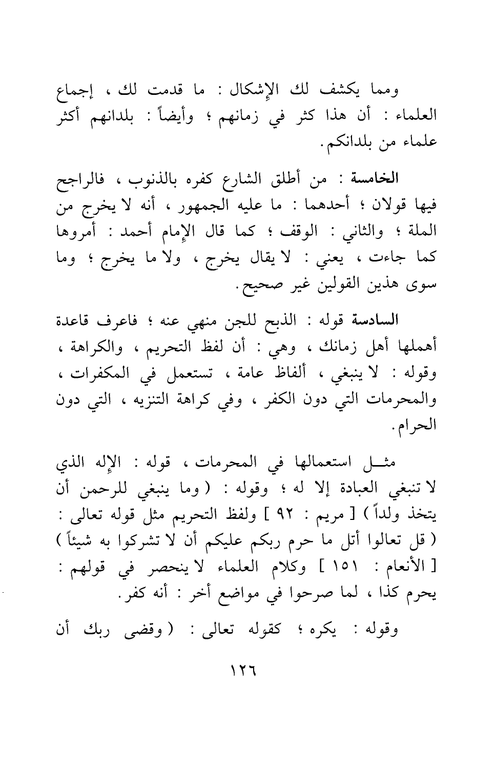 السادسة: قوله: الذبح للجن منهي عنه; فاعرف قاعدة أهملها أهل زمانك، وهي: أن لفظ التحريم، والكراهة، وقوله: لا ينبغي، ألفاظ عامة، تستعمل في المكفرات، والمحرمات التي دون الكفر، وفي كراهة التنْزيه، التي دون الحرام.