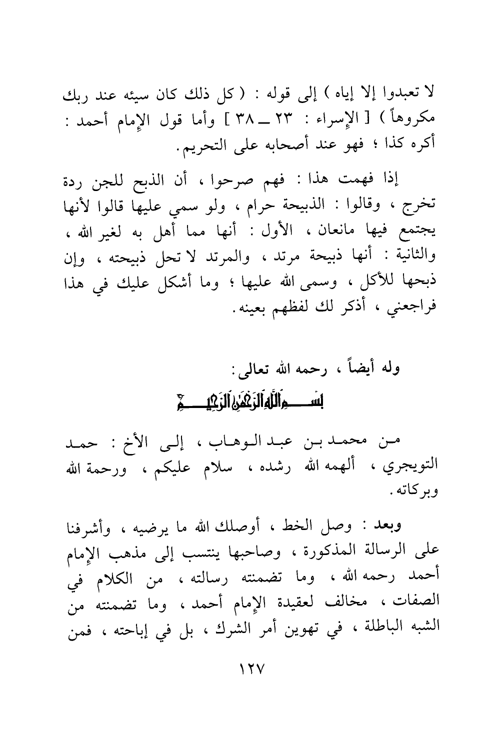 وبعد: وصل الخط، أوصلك الله ما يرضيه، وأشرفنا على الرسالة المذكورة؛ وصاحبها ينتسب إلى مذهب الإمام أحمد رحمه الله، وما تضمنته رسالته، من الكلام في الصفات، مخالف لعقيدة الإمام أحمد، وما تضمنته من الشبه الباطلة، في تهوين أمر الشرك، بل في إباحته، فمن