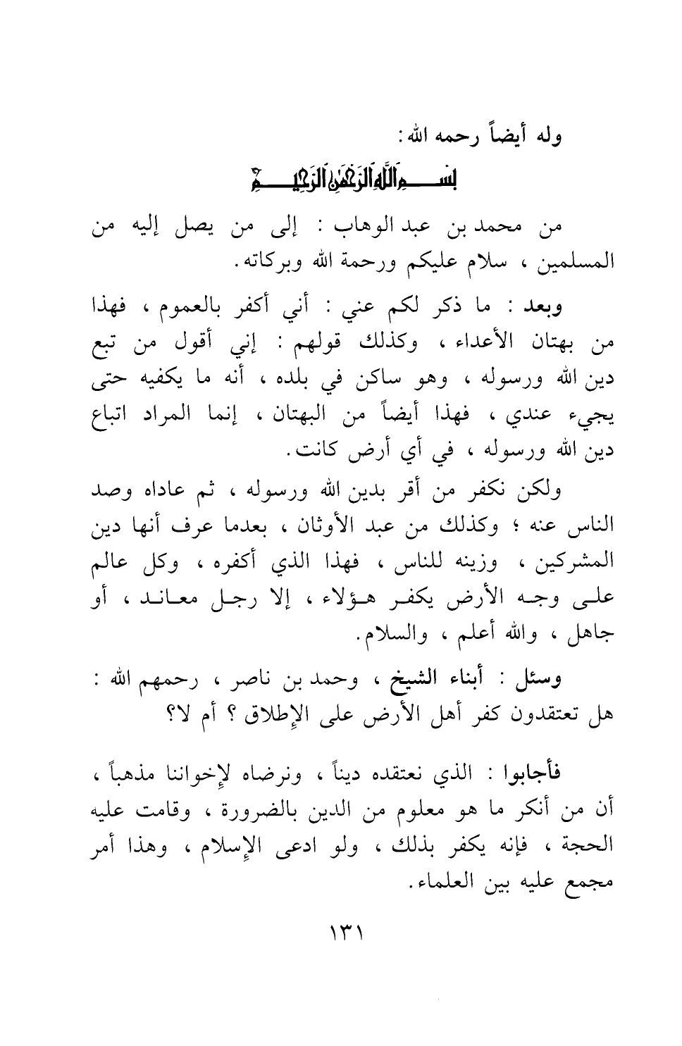 وبعد: ما ذكر لكم عني: أني أكفر بالعموم، فهذا من بهتان الأعداء، وكذلك قولهم: إني أقول من تبع دين الله ورسوله، وهو ساكن في بلده، أنه ما يكفيه حتى يجيء عندي، فهذا أيضا من البهتان؛ إنما المراد اتباع دين الله ورسوله، في أي أرض كانت.