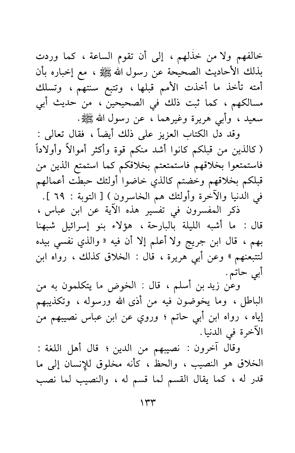 خالفهم ولا من خذلهم، إلى أن تقوم الساعة، كما وردت بذلك الأحاديث الصحيحة عن رسول الله صلى الله عليه وسلم، مع إخباره بأن أمته تأخذ ما أخذت الأمم قبلها، وتتبع سنتهم، وتسلك مسالكهم، كما ثبت ذلك في الصحيحين، من حديث أبي سعيد، وأبي هريرة وغيرهما، عن رسول الله صلى الله عليه وسلم.