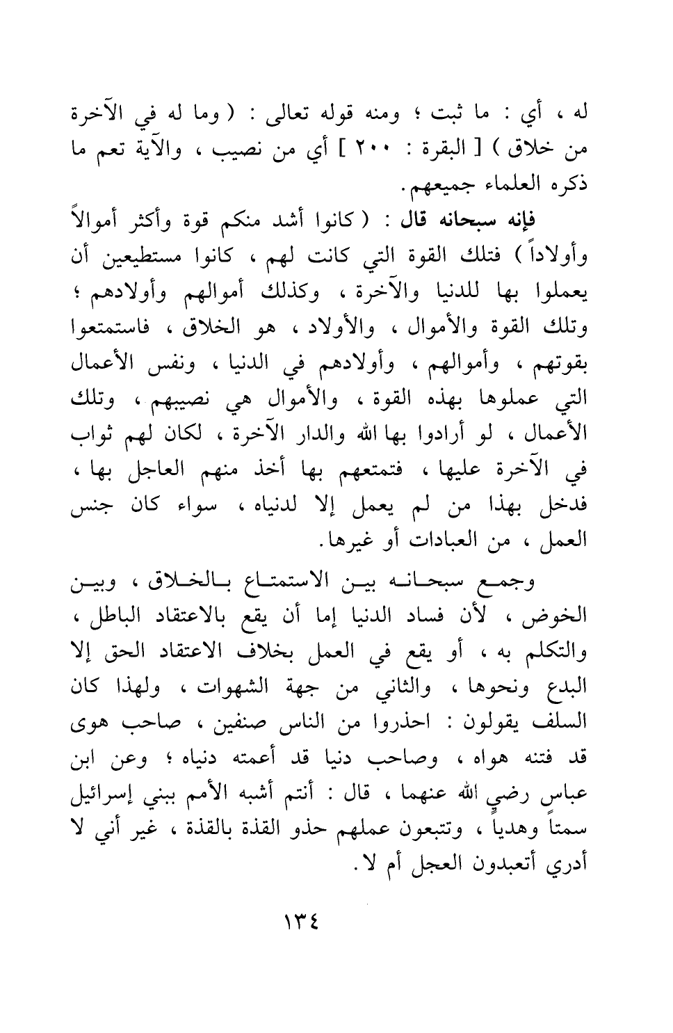 فإنه سبحانه قال: {كَانُوا أَشَدَّ مِنْكُمْ قُوَّةً وَأَكْثَرَ أَمْوَالاً وَأَوْلاداً} 2، فتلك القوة التي كانت لهم، كانوا مستطيعين أن يعملوا بها للدنيا والآخرة، وكذلك أموالهم وأولادهم، وتلك القوة والأموال والأولاد، هو الخلاق، فاستمتعوا بقوتهم، وأموالهم، وأولادهم في الدنيا، ونفس الأعمال التي عملوها بهذه القوة، والأموال هي نصيبهم؛ وتلك الأعمال، لو أرادوا بها الله والدار الآخرة، لكان لهم ثواب في الآخرة عليها، فتمتعهم بها أخذ منهم العاجل بها؛ فدخل بهذا من لم يعمل إلا لدنياه، سواء كان جنس العمل من العبادات أو غيرها.