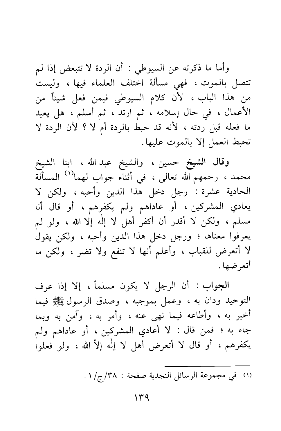 وقال الشيخ حسين، والشيخ عبد الله، ابنا الشيخ محمد، رحمهم الله تعالى، في أثناء جواب لهما 1: المسألة الحادية عشرة: رجل دخل هذا الدين وأحبه، ولكن لا يعادي المشركين، أو عاداهم ولم يكفرهم، أو قال: أنا مسلم، ولكن لا أقدر أن أكفّر أهل لا إله إلا الله، ولو لم يعرفوا معناها، ورجل دخل هذا الدين وأحبه، ولكن يقول: لا أتعرض للقباب، وأعلم أنها لا تنفع ولا تضر، ولكن ما أتعرضها.