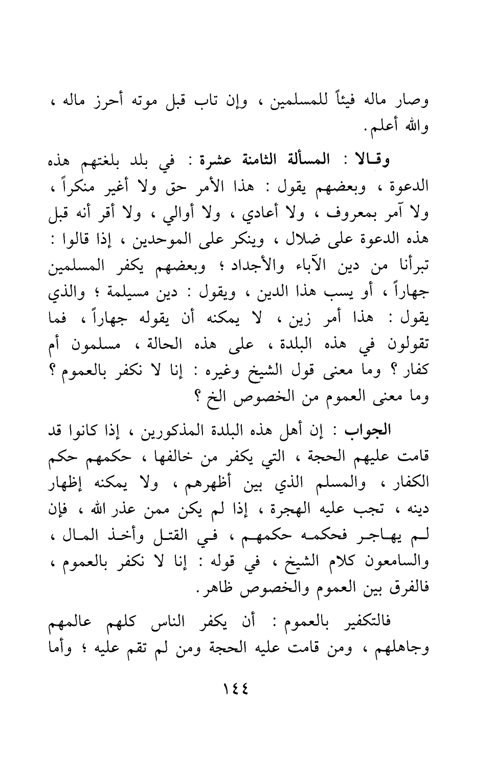 وقالا: المسألة الثامنة عشرة: في بلد بلغتهم هذه الدعوة، وبعضهم يقول: هذا الأمر حق ولا أغير منكرا، ولا آمر بمعروف، ولا أعادي، ولا أوالي، ولا أقر أنه قبل هذه الدعوة على ضلال، وينكر على الموحدين، إذا قالوا: تبرأنا من دين الآباء والأجداد; وبعضهم يكفر المسلمين جهارا، أو يسب هذا الدين، ويقول: دين مسيلمة; والذي يقول: هذا أمر زين، لا يمكنه أن يقوله جهارا؛ فما تقولون في هذه البلدة، على هذه الحالة، مسلمون أم كفار؟ وما معنى قول الشيخ وغيره: إنا لا نكفّر بالعموم؟ وما معنى العموم من الخصوص إلخ؟