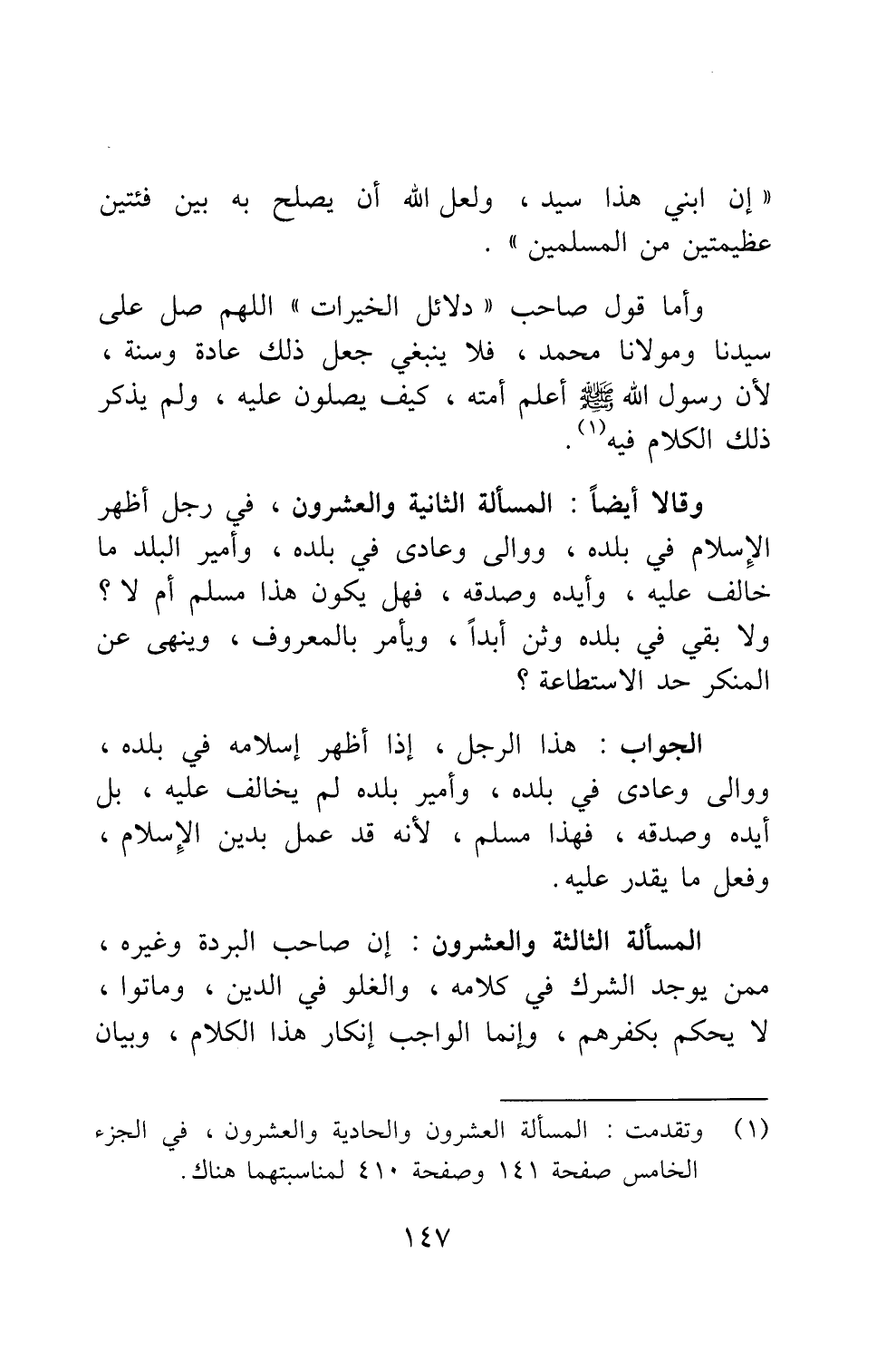 " إن ابني هذا سيد، ولعل الله أن يصلح به بين فئتين عظيمتين من المسلمين " 1. وأما قول صاحب "دلائل الخيرات": اللهم صل على سيدنا ومولانا محمد، فلا ينبغي جعل ذلك عادة وسنة، لأن رسول الله صلى الله عليه وسلم أعلم أمته، كيف يصلون عليه، ولم يذكر ذلك الكلام فيه 2.