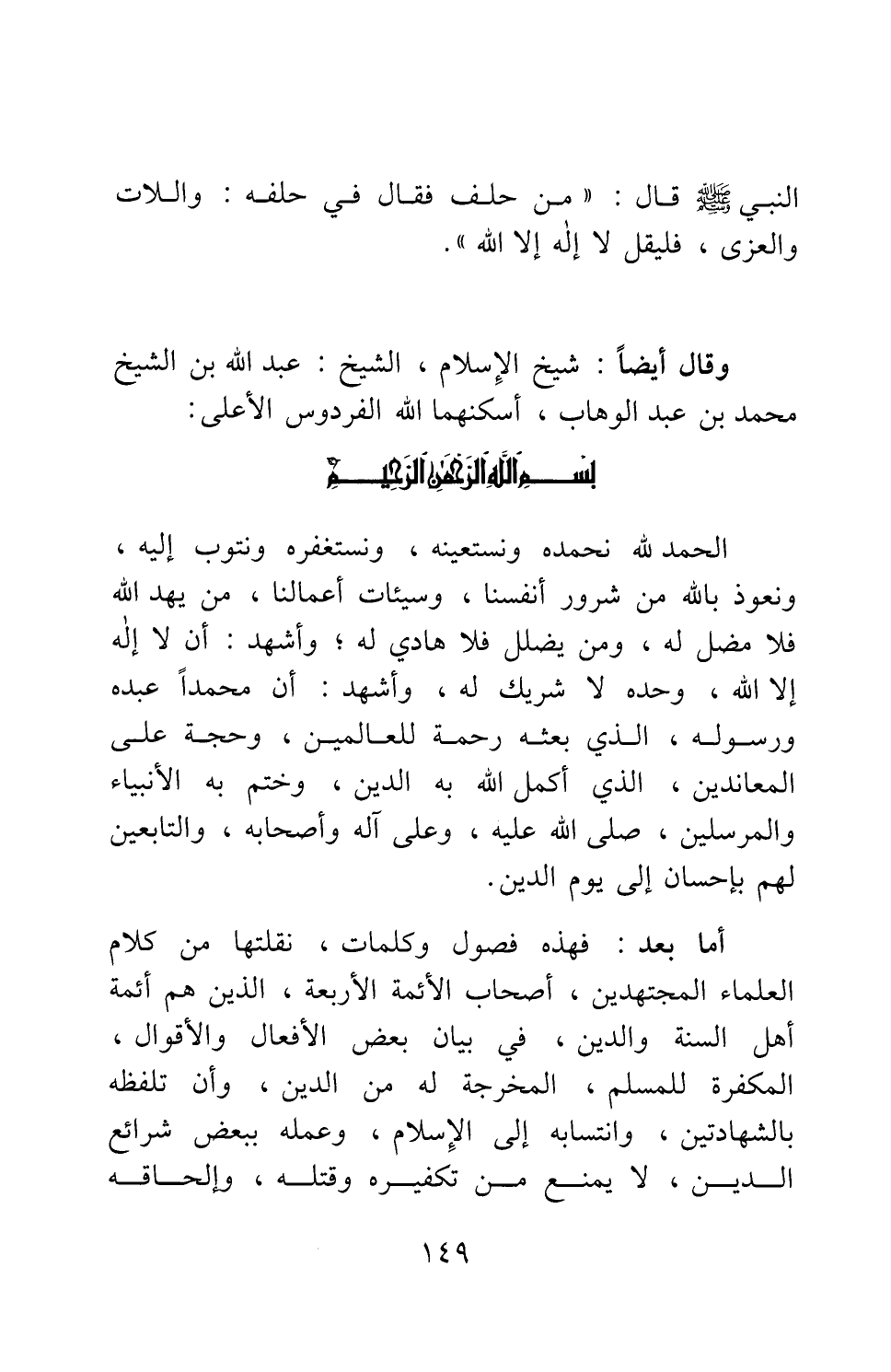 أما بعد: فهذه فصول وكلمات، نقلتها من كلام العلماء المجتهدين، أصحاب الأئمة الأربعة، الذين هم أئمة أهل السنة والدين، في بيان بعض الأفعال والأقوال المكفرة للمسلم، المخرجة له من الدين، وأن تلفظه بالشهادتين، وانتسابه إلى الإسلام، وعمله ببعض شرائع الدين، لا يمنع من تكفيره وقتله، وإلحاقه