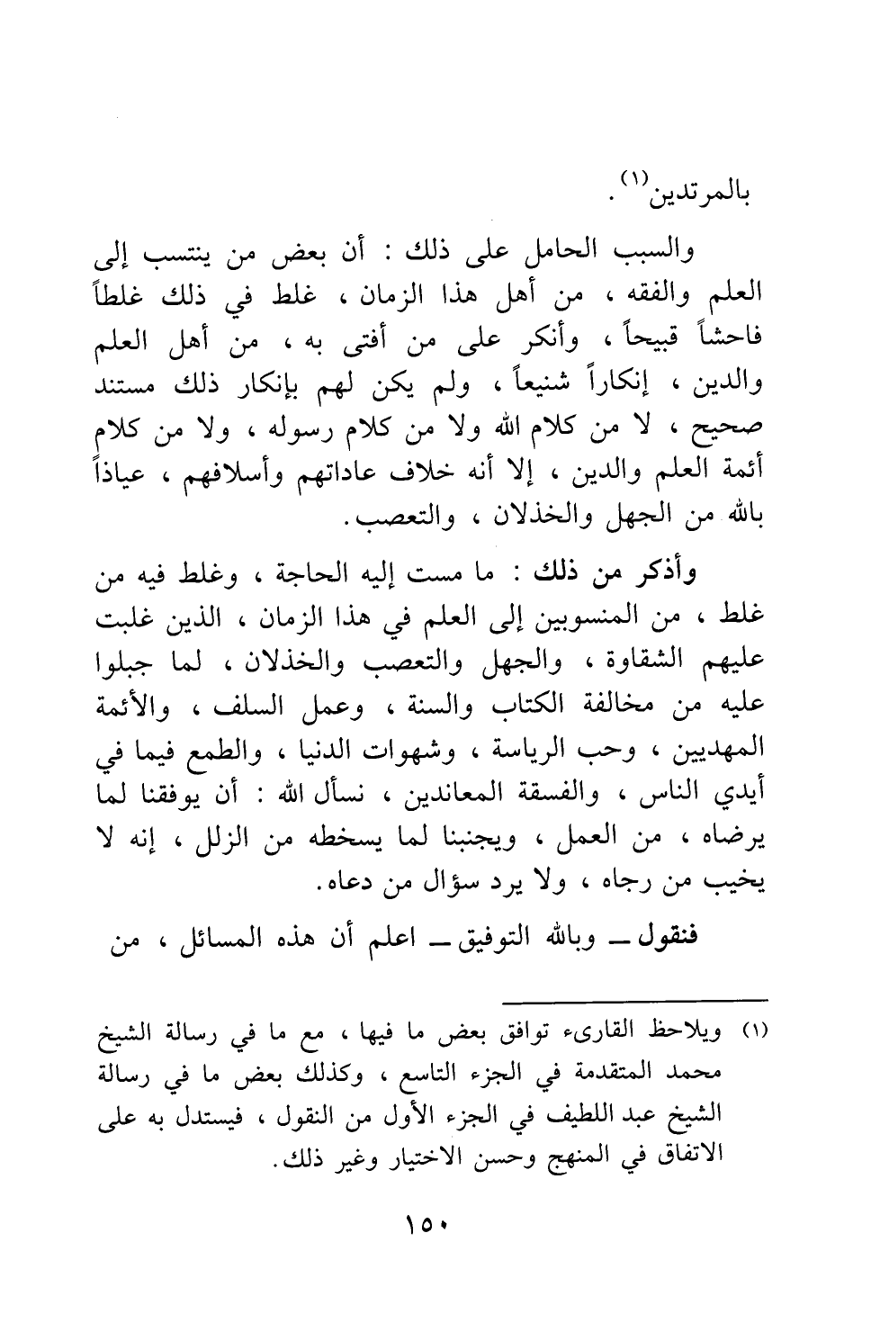 1 ويلاحظ القارئ توافق بعض ما فيها, مع ما في رسالة الشيخ محمد المتقدمة في الجزء التاسع, وكذلك بعض ما في رسالة الشيخ عبد اللطيف في الجزء الأول من النقول, فيستدل به على الاتفاق في المنهج وحسن الاختيار وغير ذلك.