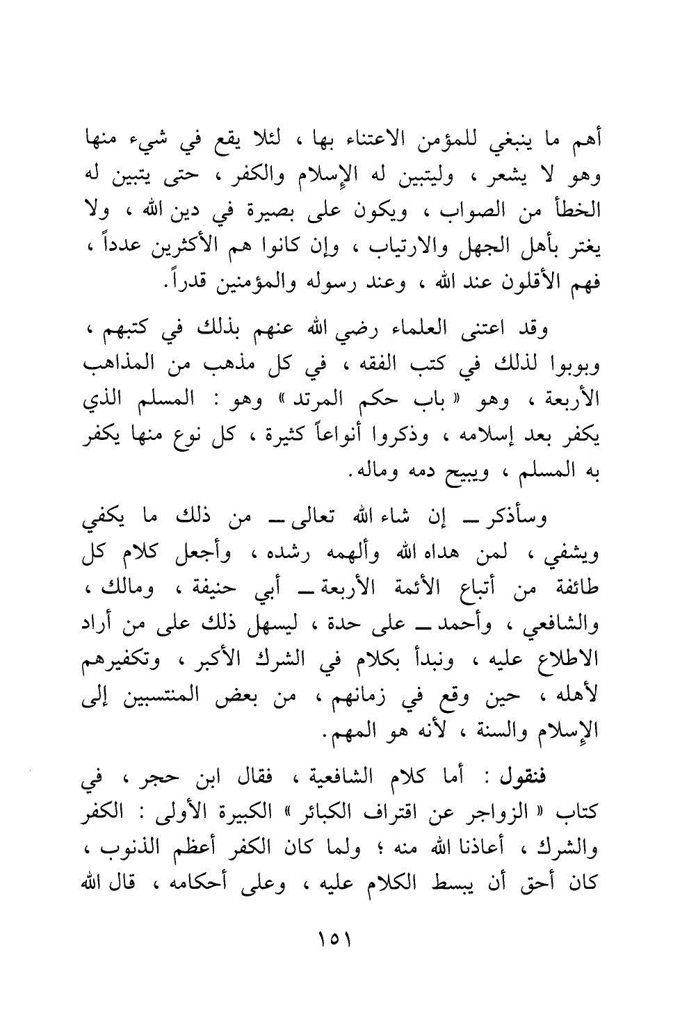 وسأذكر - إن شاء الله تعالى - من ذلك ما يكفي ويشفي، لمن هداه الله وألهمه رشده، وأجعل كلام كل طائفة من أتباع الأئمة الأربعة - أبي حنيفة، ومالك، والشافعي، وأحمد - على حدة، ليسهل ذلك على من أراد الاطلاع عليه. ونبدأ بكلام في الشرك الأكبر، وتكفيرهم لأهله، حين وقع في زمانهم، من بعض المنتسبين إلى الإسلام والسنة، لأنه هو المهم.