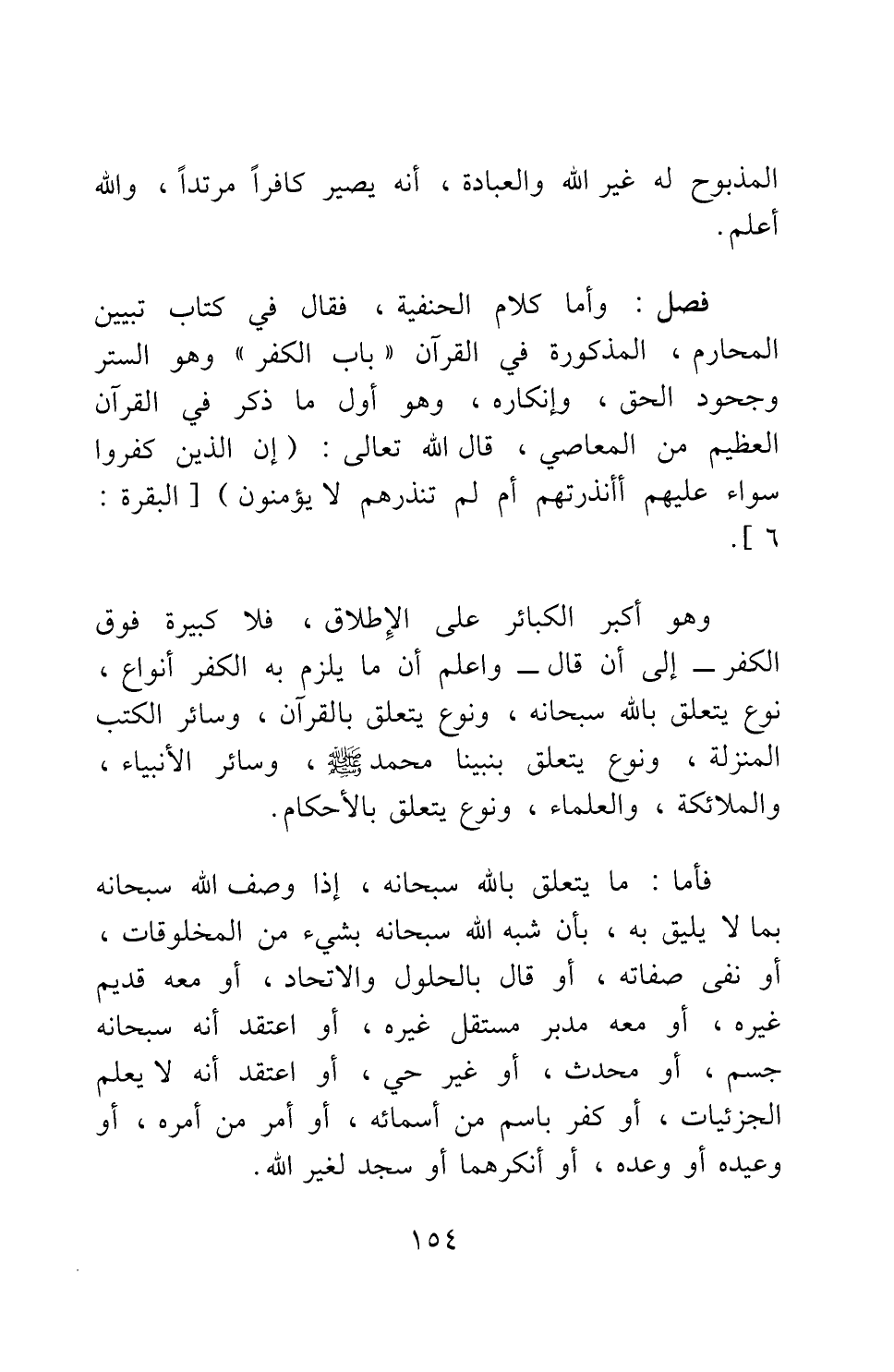 وأما كلام الحنفية: فقال في كتاب "تبيين المحارم"، المذكورة في القرآن: "باب الكفر" وهو الستر وجحود الحق، وإنكاره، وهو أول ما ذكر في القرآن العظيم من المعاصي، قال الله تعالى: {إِنَّ الَّذِينَ كَفَرُوا سَوَاءٌ عَلَيْهِمْ أَأَنْذَرْتَهُمْ أَمْ لَمْ تُنْذِرْهُمْ لا يُؤْمِنُونَ} 1.
