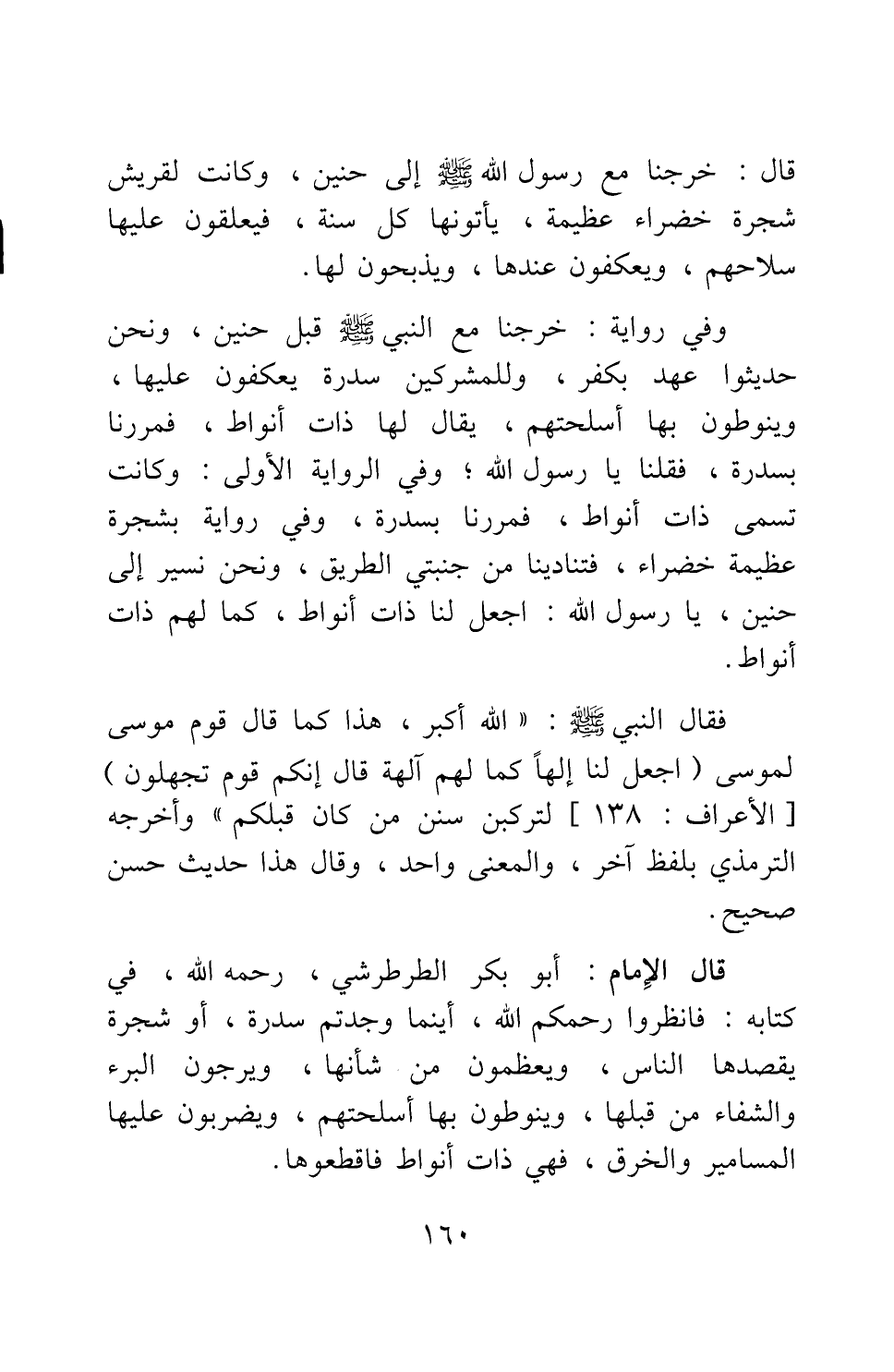 وفي رواية: خرجنا مع النبي صلى الله عليه وسلم قبل حنين، ونحن حديثو عهد بكفر، وللمشركين سدرة يعكفون عليها، وينوطون بها أسلحتهم، يقال لها ذات أنواط، فمررنا بسدرة، فقلنا يا رسول الله; وفي الرواية الأولى: وكانت تسمى ذات أنواط، فمررنا بسدرة، وفي رواية: بشجرة عظيمة خضراء، فتنادينا من جنبتي الطريق، ونحن نسير إلى حنين: يا رسول الله، اجعل لنا ذات أنواط، كما لهم ذات أنواط.