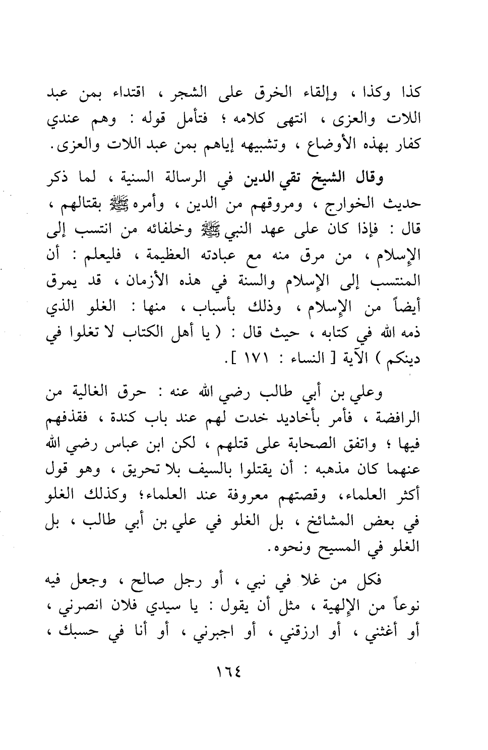 وقال الشيخ تقي الدين في "الرسالة السنية"، لما ذكر حديث الخوارج، ومروقهم من الدين، وأمره صلى الله عليه وسلم بقتالهم، قال: فإذا كان على عهد النبي صلى الله عليه وسلم وخلفائه من انتسب إلى الإسلام، من مرق منه مع عبادته العظيمة، فليعلم: أن المنتسب إلى الإسلام والسنة في هذه الأزمان، قد يمرق أيضا من الإسلام، وذلك بأسباب، منها: الغلو الذي ذمه الله في كتابه، حيث قال: {يَا أَهْلَ الْكِتَابِ لا تَغْلُوا فِي دِينِكُمْ} 1 الآية.