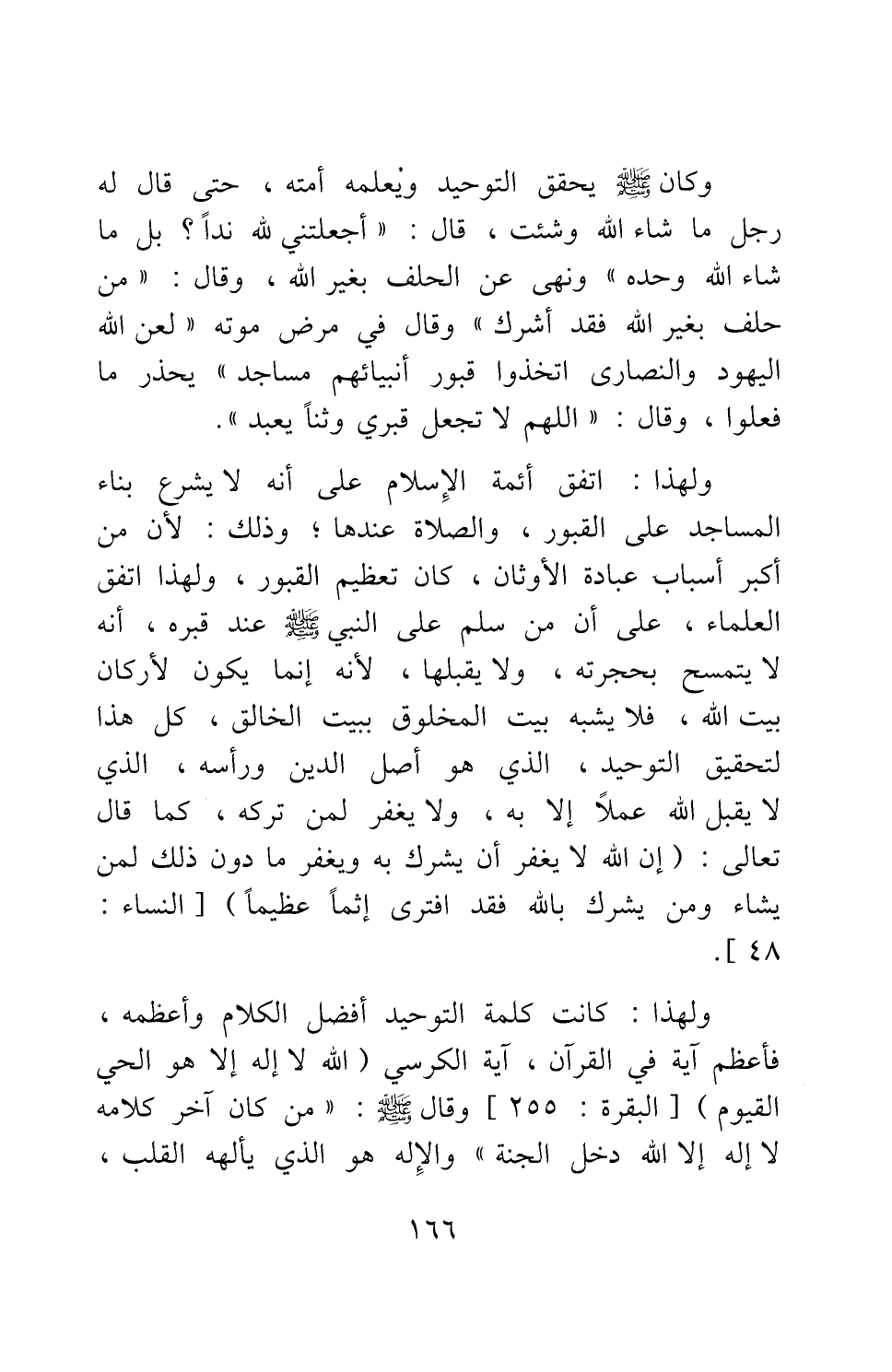 ولهذا اتفق أئمة الإسلام على أنه لا يشرع بناء المساجد على القبور، والصلاة عندها; وذلك لأن من أكبر أسباب عبادة الأوثان، كان تعظيم القبور، ولهذا اتفق العلماء، على أن من سلم على النبي صلى الله عليه وسلم عند قبره، أنه لا يتمسح بحجرته، ولا يقبلها، لأنه إنما يكون لأركان بيت الله، فلا يشبه بيت المخلوق ببيت الخالق؛ كل هذا لتحقيق التوحيد، الذي هو أصل الدين ورأسه، الذي لا يقبل الله عملا إلا به، ولا يغفر لمن تركه، كما قال تعالى: {إِنَّ اللَّهَ لا يَغْفِرُ أَنْ يُشْرَكَ بِهِ وَيَغْفِرُ مَا دُونَ ذَلِكَ لِمَنْ يَشَاءُ وَمَنْ يُشْرِكْ بِاللَّهِ فَقَدِ افْتَرَى إِثْماً عَظِيماً} 4.