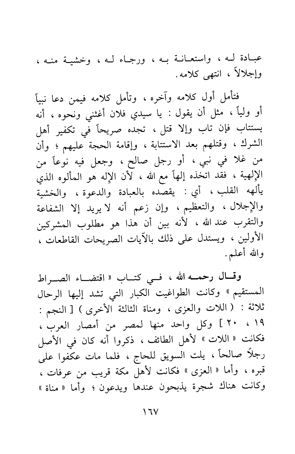 وقال رحمه الله، في كتاب "اقتضاء الصراط المستقيم": وكانت الطواغيت الكبار التي تشد إليها الرحال ثلاثة: {اللَّاتَ وَالْعُزَّى وَمَنَاةَ الثَّالِثَةَ الْأُخْرَى} 1، وكل واحد منها لمصر من أمصار العرب؛ فكانت "اللات" لأهل الطائف، ذكروا أنه كان في الأصل رجلا صالحا، يلت السويق للحاج، فلما مات عكفوا على قبره؛ وأما "العزى" فكانت لأهل مكة قريب من عرفات، وكانت هناك شجرة يذبحون عندها ويدعون; وأما "مناة"