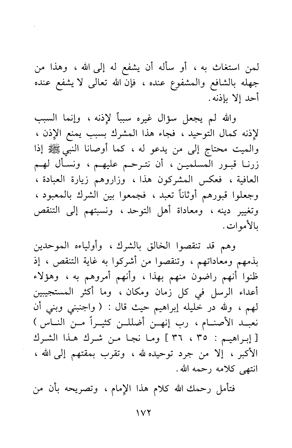 وهم قد تنقصوا الخالق بالشرك، وأولياءه الموحدين بذمهم ومعاداتهم، وتنقصوا من أشركوا به غاية التنقص، إذ ظنوا أنهم راضون منهم بهذا، وأنهم أمروهم به؛ وهؤلاء أعداء الرسل في كل زمان ومكان، وما أكثر المستجيبين لهم، ولله در خليله إبراهيم حيث قال: {وَاجْنُبْنِي وَبَنِيَّ أَنْ نَعْبُدَ الْأَصْنَامَ رَبِّ إِنَّهُنَّ أَضْلَلْنَ كَثِيراً مِنَ النَّاسِ} 1، وما نجا من شرك هذا الشرك الأكبر، إلا من جرد توحيده لله، وتقرب بمقتهم إلى الله؛ انتهى كلامه رحمه الله.