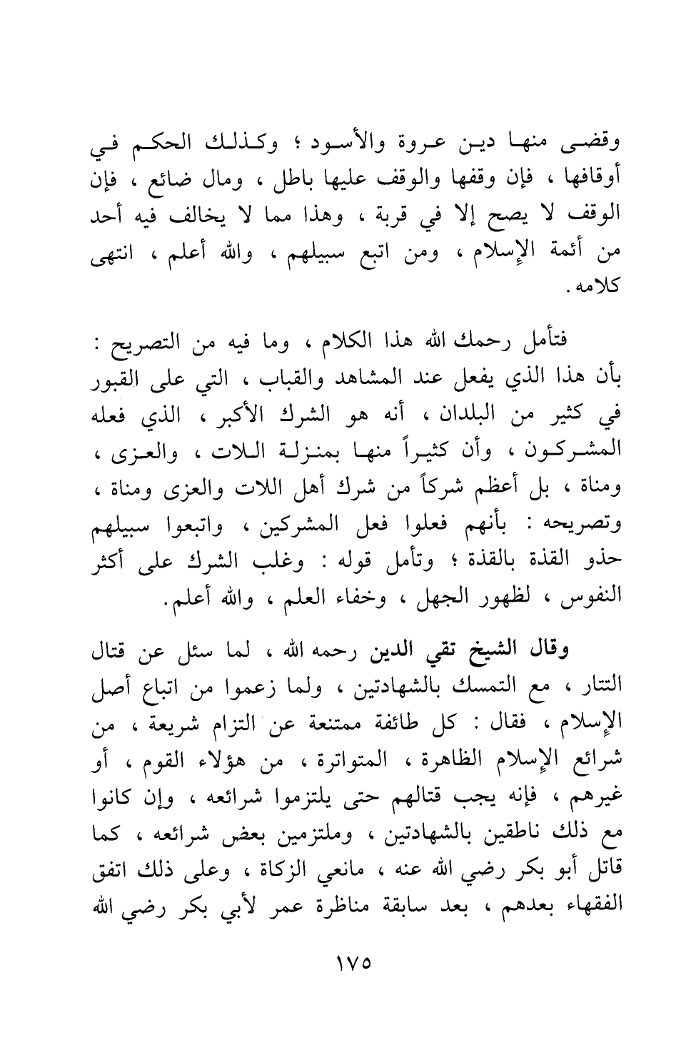 وقال الشيخ تقي الدين رحمه الله، لما سئل عن قتال التتار، مع التمسك بالشهادتين، ولما زعموا من اتباع أصل الإسلام، فقال: كل طائفة ممتنعة عن التزام شريعة من شرائع الإسلام الظاهرة، المتواترة، من هؤلاء القوم، أو غيرهم، فإنه يجب قتالهم حتى يلتزموا شرائعه، وإن كانوا مع ذلك ناطقين بالشهادتين، وملتزمين بعض شرائعه، كما قاتل أبو بكر رضي الله عنه مانعي الزكاة؛ وعلى ذلك اتفق الفقهاء بعدهم، بعد سابقة مناظرة عمر لأبي بكر رضي الله