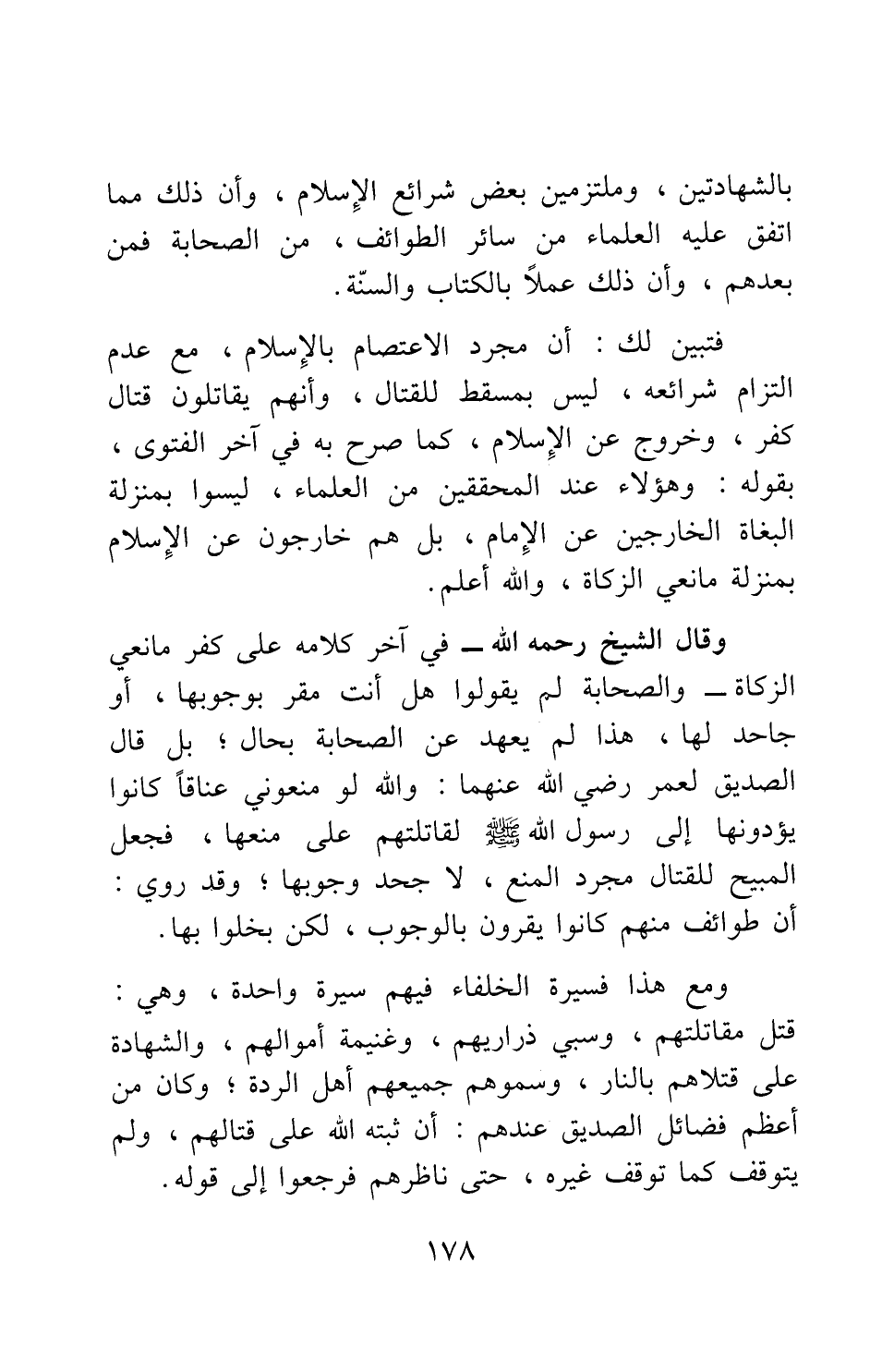 وقال الشيخ رحمه الله، في آخر كلامه على كفر مانعي الزكاة: والصحابة لم يقولوا: هل أنت مقر بوجوبها، أو جاحد لها، هذا لم يعهد عن الصحابة بحال، بل قال الصديق لعمر رضي الله عنهما: (والله لو منعوني عناقا كانوا يؤدونها إلى رسول الله صلى الله عليه وسلم لقاتلتهم على منعها) ، فجعل المبيح للقتال مجرد المنع، لا جحد وجوبها; وقد روي: أن طوائف منهم كانوا يقرون بالوجوب، لكن بخلوا بها.