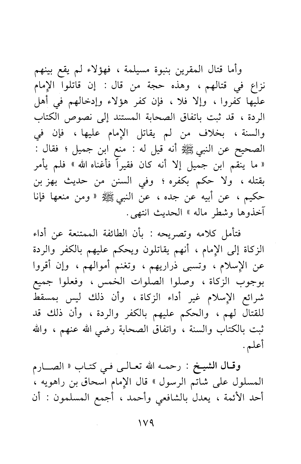 فتأمل كلامه وتصريحه: بأن الطائفة الممتنعة عن أداء الزكاة إلى الإمام، أنهم يقاتلون ويحكم عليهم بالكفر والردة عن الإسلام، وتسبى ذراريهم، وتغنم أموالهم، وإن أقروا بوجوب الزكاة، وصلوا الصلوات الخمس، وفعلوا جميع شرائع الإسلام غير أداء الزكاة، وأن ذلك ليس بمسقط للقتال لهم، والحكم عليهم بالكفر والردة، وأن ذلك قد ثبت بالكتاب والسنة، واتفاق الصحابة رضي الله عنهم، والله أعلم.