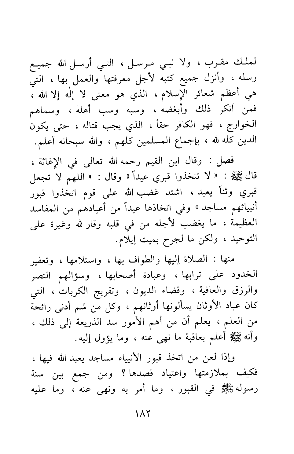 وقال ابن القيم رحمه الله تعالى في "الإغاثة": قال صلى الله عليه وسلم: " لا تتخذوا قبري عيدا " 1، وقال: " اللهم لا تجعل قبري وثنا يعبد، اشتد غضب الله على قوم اتخذوا قبور أنبيائهم مساجد " 2؛ وفي اتخاذها عيدا من أعيادهم من المفاسد العظيمة، ما يغضب لأجله من في قلبه وقار لله وغيرة على التوحيد؛ ولكن ما لجرح بميت إيلام.