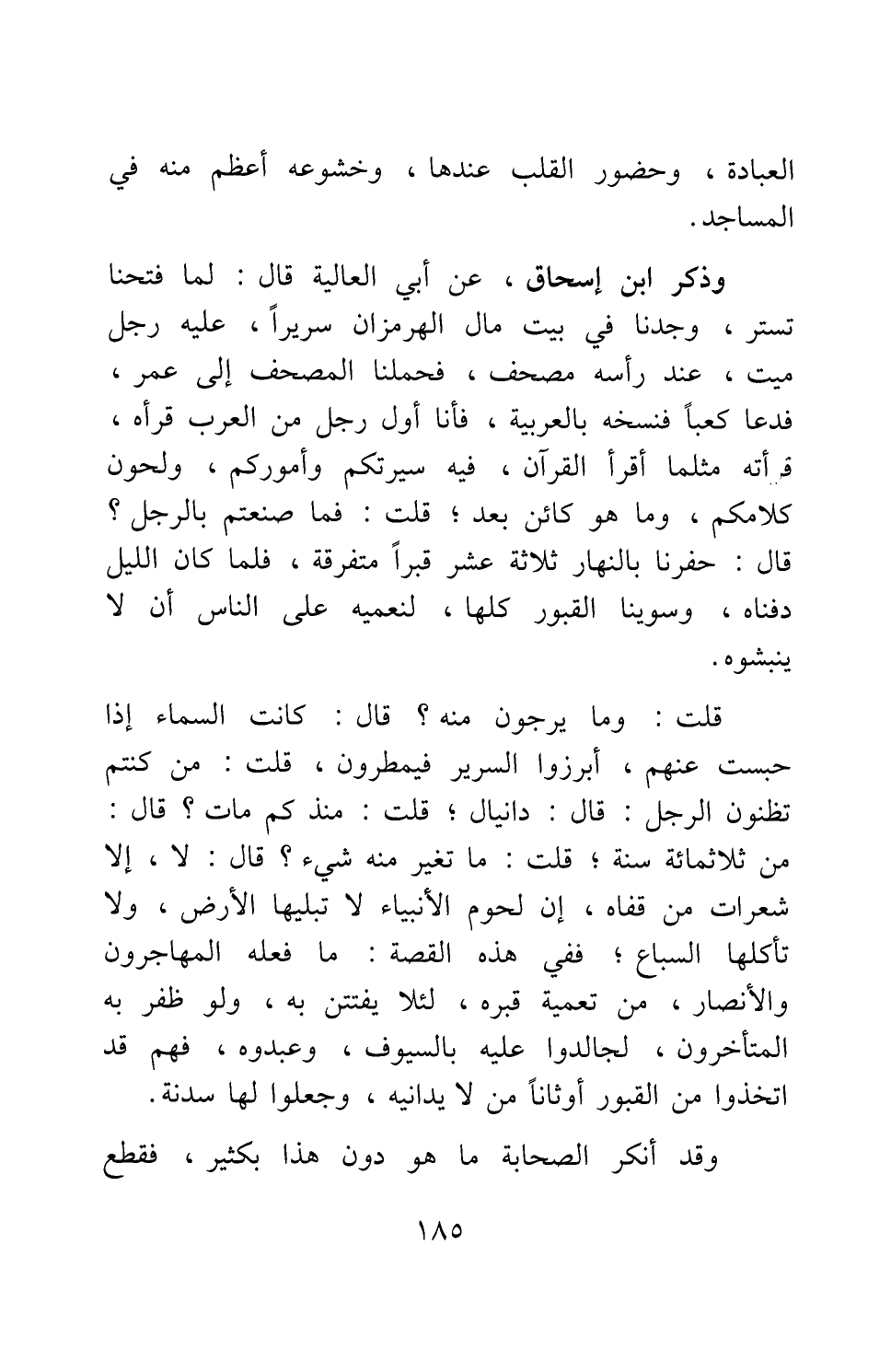 العبادة، وحضور القلب عندها، وخشوعه أعظم منه في المساجد. وذكر ابن إسحاق، عن أبي العالية قال: لما فتحنا تستر، وجدنا في بيت مال الهرمزان سريرا، عليه رجل ميت، عند رأسه مصحف، فحملنا المصحف إلى عمر، فدعا كعبا فنسخه بالعربية، فأنا أول رجل من العرب قرأه؛ قرأته مثلما أقرأ القرآن، فيه سيرتكم وأموركم، ولحون كلامكم، وما هو كائن بعد; قلت: فما صنعتم بالرجل؟ قال: حفرنا بالنهار ثلاثة عشر قبرا متفرقة، فلما كان الليل دفناه، وسوينا القبور كلها، لنعميه على الناس أن لا ينبشوه.