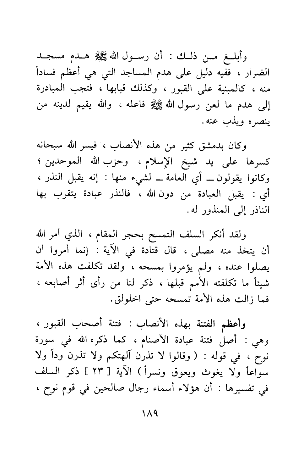 وأبلغ من ذلك: "أن رسول الله صلى الله عليه وسلم هدم مسجد الضرار" ففيه دليل على هدم المساجد التي هي أعظم فسادا منه، كالمبنية على القبور، وكذلك قبابها؛ فتجب المبادرة إلى هدم ما لعن رسول الله صلى الله عليه وسلم فاعله، والله يقيم لدينه من ينصره ويذب عنه.