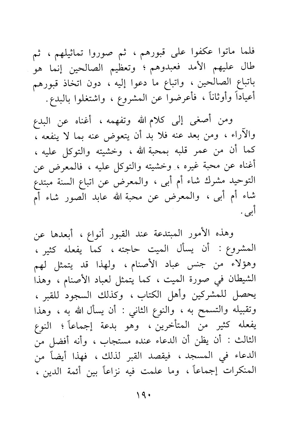 فلما ماتوا عكفوا على قبورهم، ثم صوروا تماثيلهم، ثم طال عليهم الأمد فعبدوهم; وتعظيم الصالحين إنما هو باتباع الصالحين، واتباع ما دعوا إليه، دون اتخاذ قبورهم أعيادا وأوثانا، فأعرضوا عن المشروع، واشتغلوا بالبدع. ومن أصغى إلى كلام الله وتفهمه، أغناه عن البدع والآراء، ومن بعد عنه فلا بد أن يتعوض عنه بما لا ينفعه، كما أن من عمر قلبه بمحبة الله، وخشيته والتوكل عليه، أغناه عن محبة غيره، وخشيته والتوكل عليه؛ فالمعرض عن التوحيد مشرك شاء أم أبى، والمعرض عن اتباع السنة مبتدع شاء أم أبى، والمعرض عن محبة الله عابد الصور شاء أم أبى.