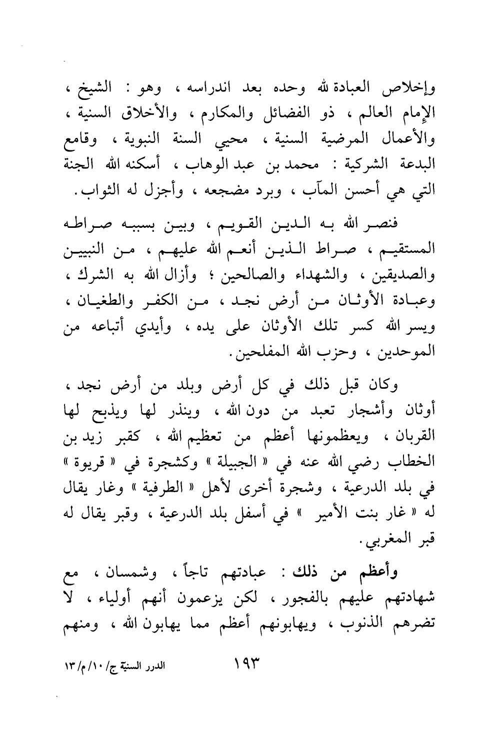 وكان قبل ذلك في كل أرض وبلد من أرض نجد، أوثان وأشجار تعبد من دون الله، وينذر لها ويذبح لها القربان، ويعظمونها أعظم من تعظيم الله، كقبر زيد بن الخطاب رضي الله عنه في "الجبيلة" وكشجرة في "قريوة" في بلد الدرعية، وشجرة أخرى لأهل "الطرفية"، وغار يقال له "غار بنت الأمير" في أسفل بلد الدرعية، وقبر يقال له قبر المغربي.