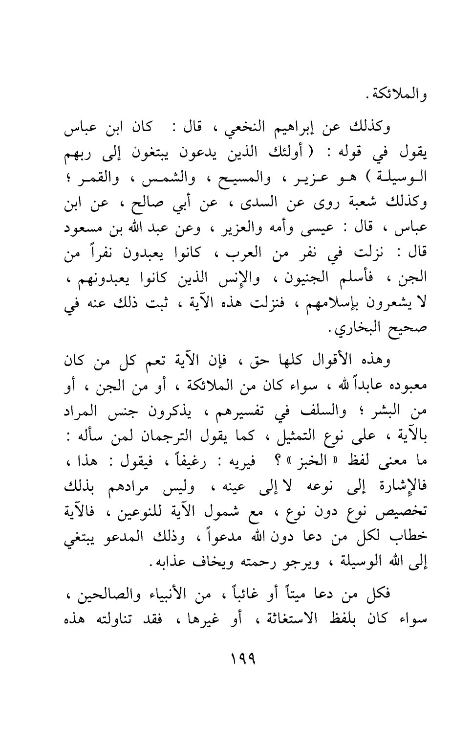 وكذلك عن إبراهيم النخعي، قال: كان ابن عباس يقول في قوله: {أُولَئِكَ الَّذِينَ يَدْعُونَ يَبْتَغُونَ إِلَى رَبِّهِمُ الْوَسِيلَةَ} 1: (هو عزير، والمسيح، والشمس، والقمر) ; وكذلك شعبة روى عن السدي، عن أبي صالح، عن ابن عباس، قال: (عيسى وأمه والعزير) ، وعن عبد الله بن مسعود قال: (نزلت في نفر من العرب، كانوا يعبدون نفرا من الجن، فأسلم الجنيون، والإنس الذين كانوا يعبدونهم، لا يشعرون بإسلامهم، فنَزلت هذه الآية) ، ثبت ذلك عنه في صحيح البخاري.