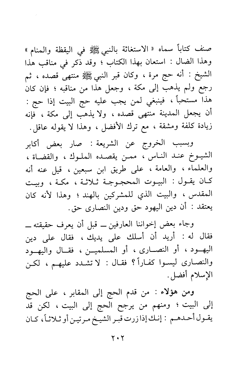 صنف كتابا أسماه "الاستغاثة بالنبي صلى الله عليه وسلم في اليقظة والمنام"، وهذا الضال استعان بهذا الكتاب، وقد ذكر في مناقب هذا الشيخ: أنه حج مرة، وكان قبر النبي صلى الله عليه وسلم منتهى قصده، ثم رجع ولم يذهب إلى مكة، وجعل هذا من مناقبه؛ فإن كان هذا مستحبا، فينبغي لمن يجب عليه حج البيت إذا حج أن يجعل المدينة منتهى قصده، ولا يذهب إلى مكة، فإنه زيادة كلفة ومشقة، مع ترك الأفضل، وهذا لا يقوله عاقل. وبسبب الخروج عن الشريعة صار بعض أكابر الشيوخ عند الناس، ممن يقصده الملوك، والقضاة، والعلماء، والعامة، على طريق ابن سبعين، قيل عنه أنه كان يقول: البيوت المحجوجة ثلاثة: مكة، وبيت المقدس، والبيت الذي للمشركين بالهند، وهذا لأنه كان يعتقد أن دين اليهود حق ودين النصارى حق.
