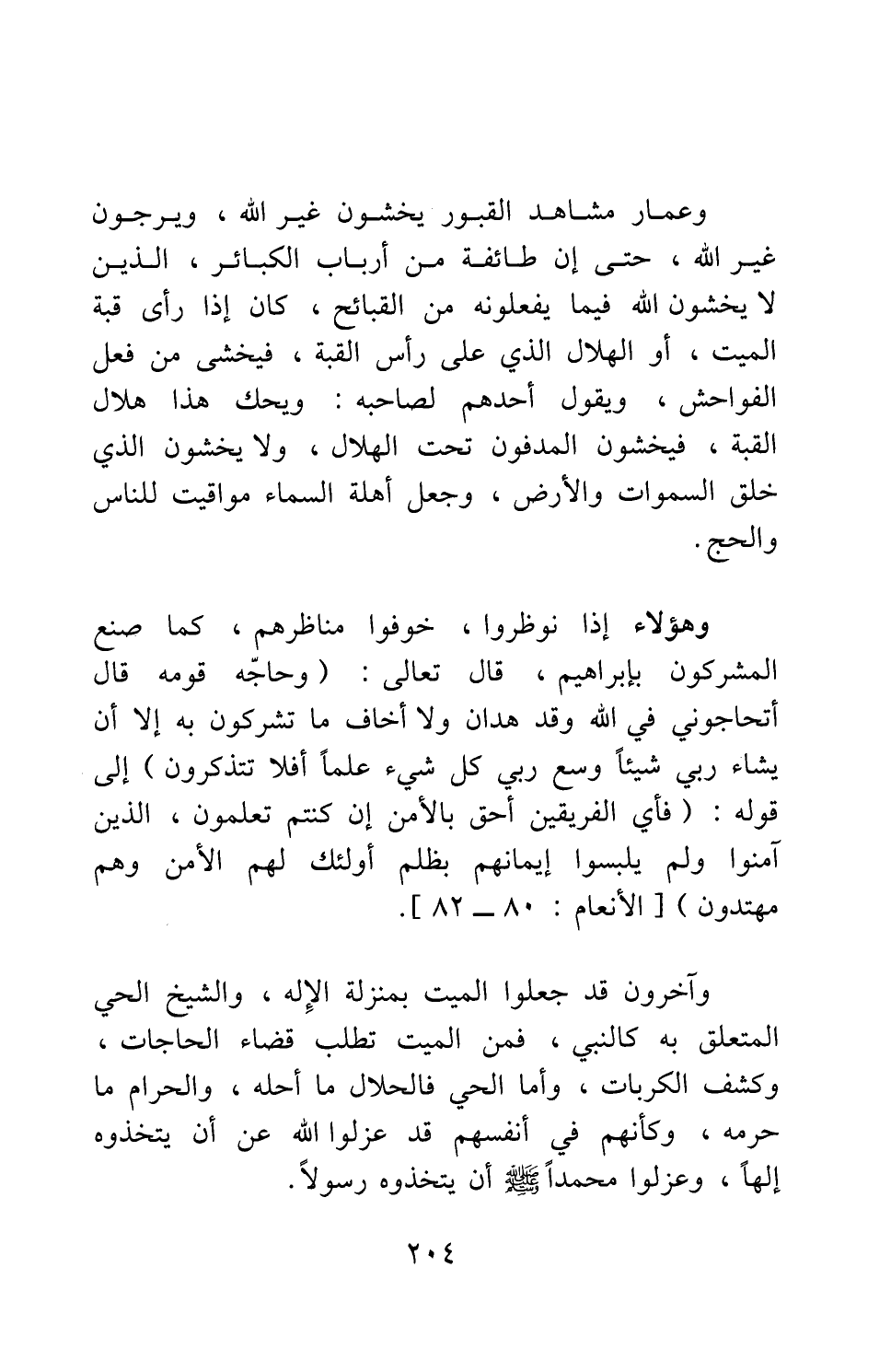 وعمار مشاهد القبور يخشون غير الله، ويرجون غير الله، حتى إن طائفة من أرباب الكبائر، الذين لا يخشون الله فيما يفعلونه من القبائح، كان إذا رأى قبة الميت، أو الهلال الذي على رأس القبة، فيخشى من فعل الفواحش، ويقول أحدهم لصاحبه: ويحك هذا هلال القبة، فيخشون المدفون تحت الهلال، ولا يخشون الذي خلق السماوات والأرض، وجعل أهلة السماء مواقيت للناس والحج. وهؤلاء إذا نوظروا، خوفوا مناظرهم، كما صنع المشركون بإبراهيم، قال تعالى: {وَحَاجَّهُ قَوْمُهُ قَالَ أَتُحَاجُّونِّي فِي اللَّهِ وَقَدْ هَدَانِ وَلا أَخَافُ مَا تُشْرِكُونَ بِهِ إِلَّا أَنْ يَشَاءَ رَبِّي شَيْئاً وَسِعَ رَبِّي كُلَّ شَيْءٍ عِلْماً أَفَلا تَتَذَكَّرُونَ} 1 إلى قوله: {فَأَيُّ الْفَرِيقَيْنِ أَحَقُّ بِالْأَمْنِ إِنْ كُنْتُمْ تَعْلَمُونَ الَّذِينَ آمَنُوا وَلَمْ يَلْبِسُوا إِيمَانَهُمْ بِظُلْمٍ أُولَئِكَ لَهُمُ الْأَمْنُ وَهُمْ مُهْتَدُونَ} 2.