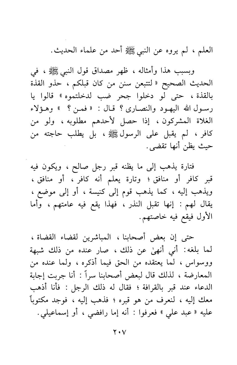 حتى إن بعض أصحابنا، المباشرين لقضاء القضاة، لما بلغه أني أنهى عن ذلك، صار عنده من ذلك شبهة ووسواس، لما يعتقده من الحق فيما أذكره، ولما عنده من المعارضة، لذلك قال لبعض أصحابنا سرا: أنا جربت إجابة الدعاء عند قبر بالقرافة، فقال له ذلك الرجل: فأنا أذهب معك إليه، لنعرف من هو قبره، فذهب إليه، فوجد مكتوبا عليه "عبد علي" فعرفوا: أنه إما رافضي، أو إسماعيلي.
