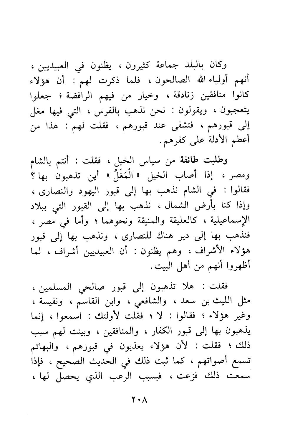 وكان بالبلد جماعة كثيرون، يظنون فى العبيديين أنهم أولياء الله الصالحون، فلما ذكرت لهم أن هؤلاء كانوا منافقين زنادقة، وخيار من فيهم الرافضة، جعلوا يتعجبون ويقولون: نحن نذهب بالفرس التي فيها مغل إلى قبورهم فتشفى عند قبورهم، فقلت لهم: هذا من أعظم الأدلة على كفرهم.