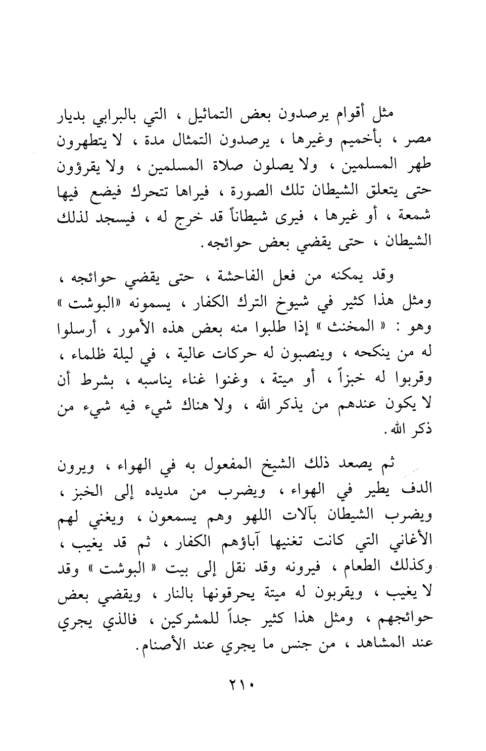 ثم يصعد ذلك الشيخ المفعول به في الهواء، ويرون الدف يطير في الهواء، ويضرب من مد يده إلى الخبز، ويضرب الشيطان بآلات اللهو وهم يسمعون، ويغني لهم الأغاني التي كانت تغنيها آباؤهم الكفار، ثم قد يغيب، وكذلك الطعام، فيرونه وقد نقل إلى بيت "البوشت"، وقد لا يغيب، ويقربون له ميتة يحرقونها بالنار، ويقضي بعض حوائجهم؛ ومثل هذا كثير جدا للمشركين، فالذي يجري عند المشاهد، من جنس ما يجري عند الأصنام.