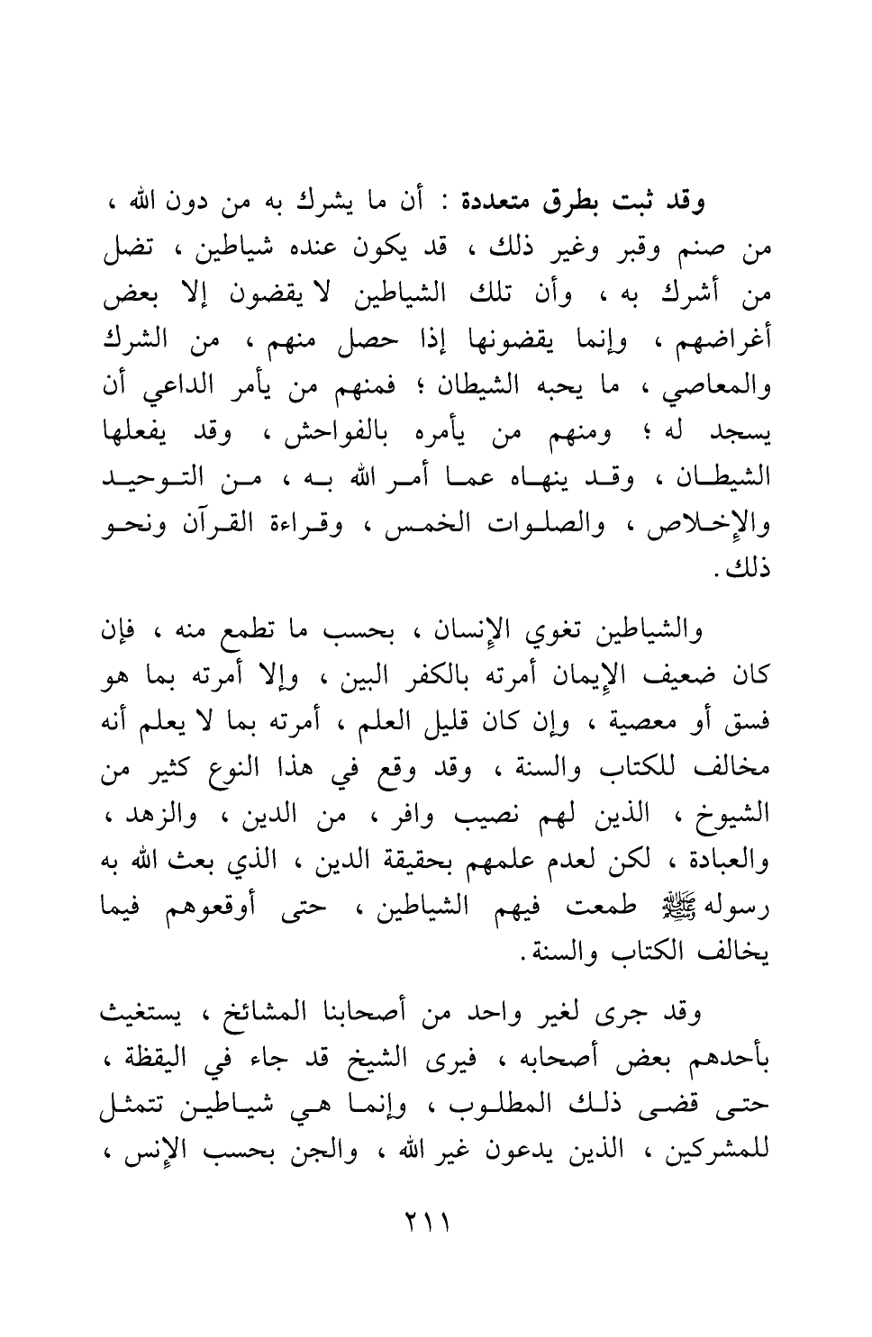 وقد ثبت بطرق متعددة: أن ما يشرك به من دون الله، من صنم وقبر وغير ذلك، قد يكون عنده شياطين، تضل من أشرك به، وأن تلك الشياطين لا يقضون إلا بعض أغراضهم، وإنما يقضونها إذا حصل منهم من الشرك والمعاصي ما يحبه الشيطان: فمنهم من يأمر الداعي أن يسجد له، ومنهم من يأمره بالفواحش، وقد يفعلها الشيطان، وقد ينهاه عما أمر الله به، من التوحيد والإخلاص، والصلوات الخمس، وقراءة القرآن ونحو ذلك.