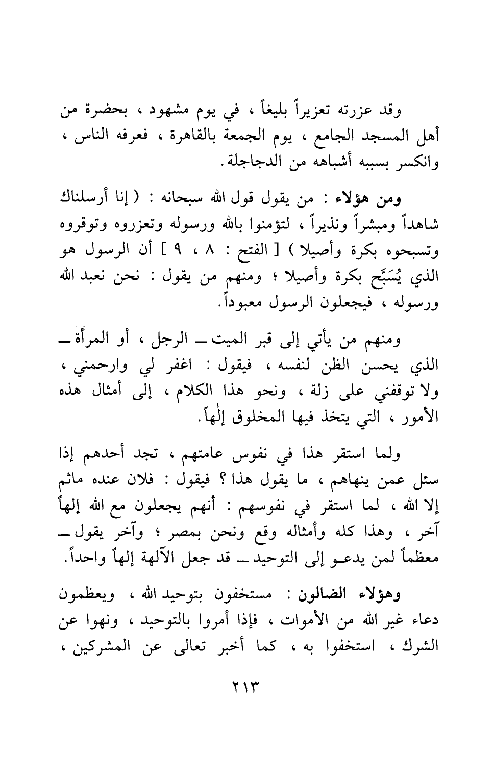 ومن هؤلاء: من يقول قول الله سبحانه: {إِنَّا أَرْسَلْنَاكَ شَاهِدًا وَمُبَشِّرًا وَنَذِيرًا لِتُؤْمِنُوا بِاللَّهِ وَرَسُولِهِ وَتُعَزِّرُوهُ وَتُوَقِّرُوهُ وَتُسَبِّحُوهُ بُكْرَةً وَأَصِيلًا} ، 1 أن الرسول هو الذي يسبح بكرة وأصيلا. ومنهم من يقول: نحن نعبد الله ورسوله، فيجعلون الرسول معبودا.