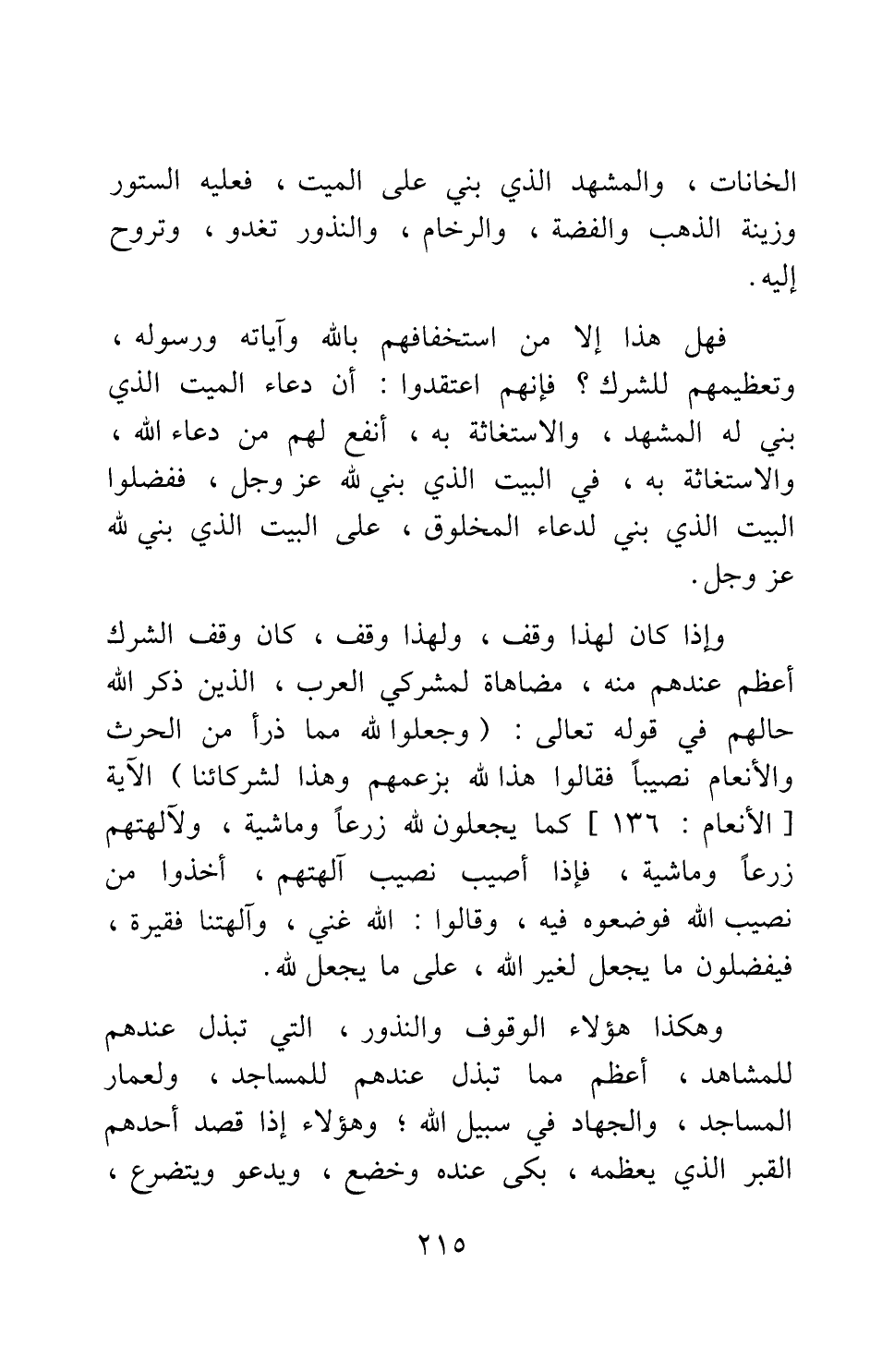 وهكذا هؤلاء الوقوف والنذور التي تبذل عندهم للمشاهد، أعظم مما تبذل عندهم للمساجد، ولعمار المساجد، والجهاد في سبيل الله؛ وهؤلاء إذا قصد أحدهم القبر الذي يعظمه، بكى عنده وخضع، ويدعو ويتضرع،