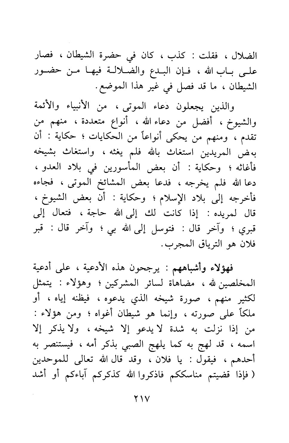 فهؤلاء وأشباههم يرجحون هذه الأدعية على أدعية المخلصين لله، مضاهاة لسائر المشركين، وهؤلاء يتمثل لكثير منهم، صورة شيخه الذي يدعوه، فيظنه إياه، أو ملكا على صورته، وإنما هو شيطان أغواه. ومن هؤلاء من إذا نزلت به شدة لا يدعو إلا شيخه، ولا يذكر إلا اسمه، قد لهج به كما يلهج الصبي بذكر أمه، فيستنصر به أحدهم، فيقول: يا فلان؛ وقد قال الله تعالى للموحدين {فَإِذَا قَضَيْتُمْ مَنَاسِكَكُمْ فَاذْكُرُوا اللَّهَ كَذِكْرِكُمْ آبَاءَكُمْ أَوْ أَشَدَّ