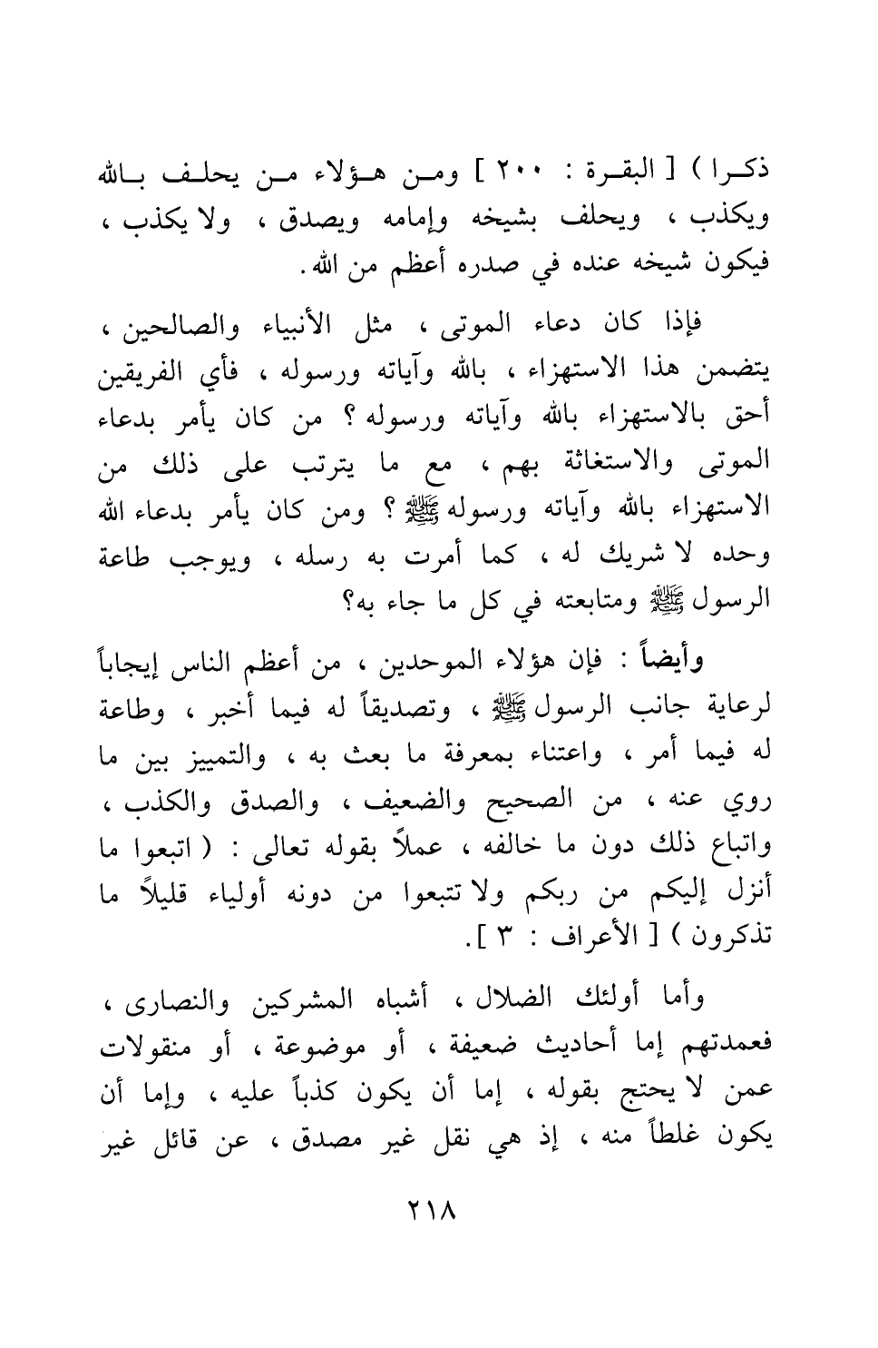 وأيضا: فإن هؤلاء الموحدين، من أعظم الناس إيجابا لرعاية جانب الرسول صلى الله عليه وسلم وتصديقا له فيما أخبر، وطاعة له فيما أمر، واعتناء بمعرفة ما بعث به، والتمييز بين ما روي عنه، من الصحيح والضعيف، والصدق والكذب، واتباع ذلك دون ما خالفه، عملا بقوله تعالى: {اتَّبِعُوا مَا أُنْزِلَ إِلَيْكُمْ مِنْ رَبِّكُمْ وَلا تَتَّبِعُوا مِنْ دُونِهِ أَوْلِيَاءَ قَلِيلاً مَا تَذَكَّرُونَ} 2.