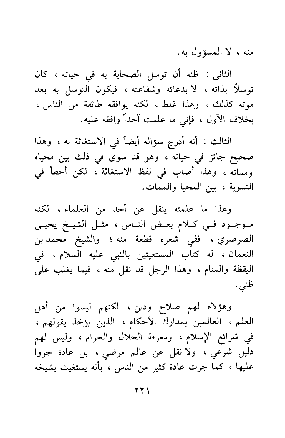 وهؤلاء لهم صلاح ودين، لكنهم ليسوا من أهل العلم، العالمين بمدارك الأحكام، الذين يؤخذ بقولهم، في شرائع الإسلام، ومعرفة الحلال والحرام، وليس لهم دليل شرعي، ولا نقل عن عالم مرضي، بل عادة جروا عليها، كما جرت عادة كثير من الناس، بأنه يستغيث بشيخه