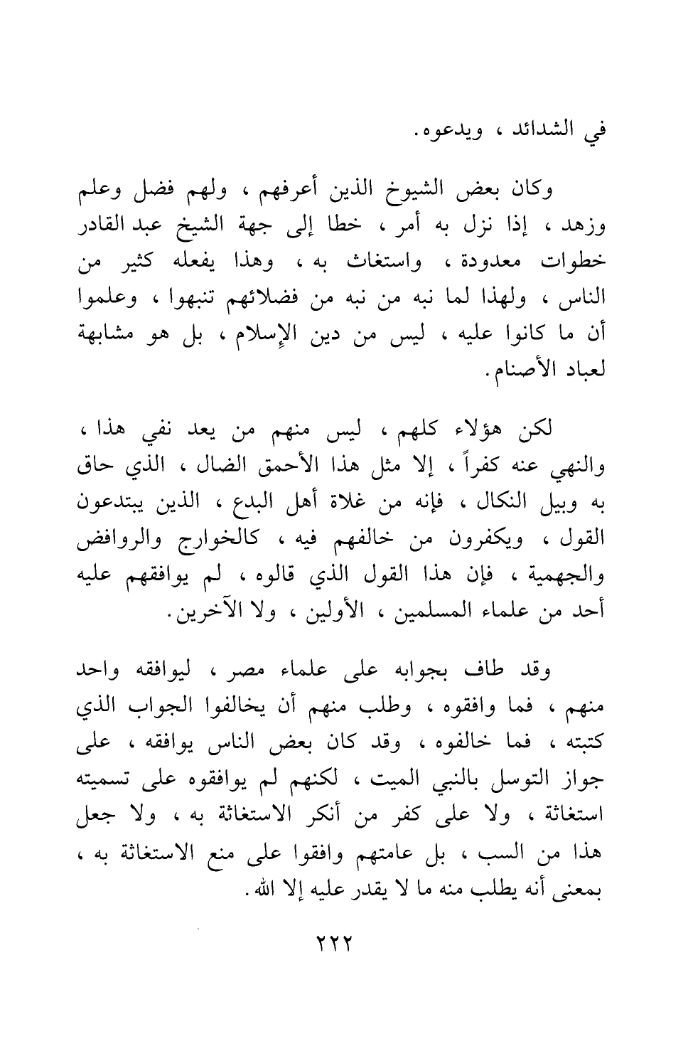 وكان بعض الشيوخ الذين أعرفهم، ولهم فضل وعلم وزهد، إذا نزل به أمر، خطا إلى جهة الشيخ عبد القادر خطوات معدودة، واستغات به، وهذا يفعله كثير من الناس؛ ولهذا لما نبه من نبه من فضلائهم تنبهوا، وعلموا أن ما كانوا عليه، ليس من دين الإسلام، بل هو مشابهة لعباد الأصنام.