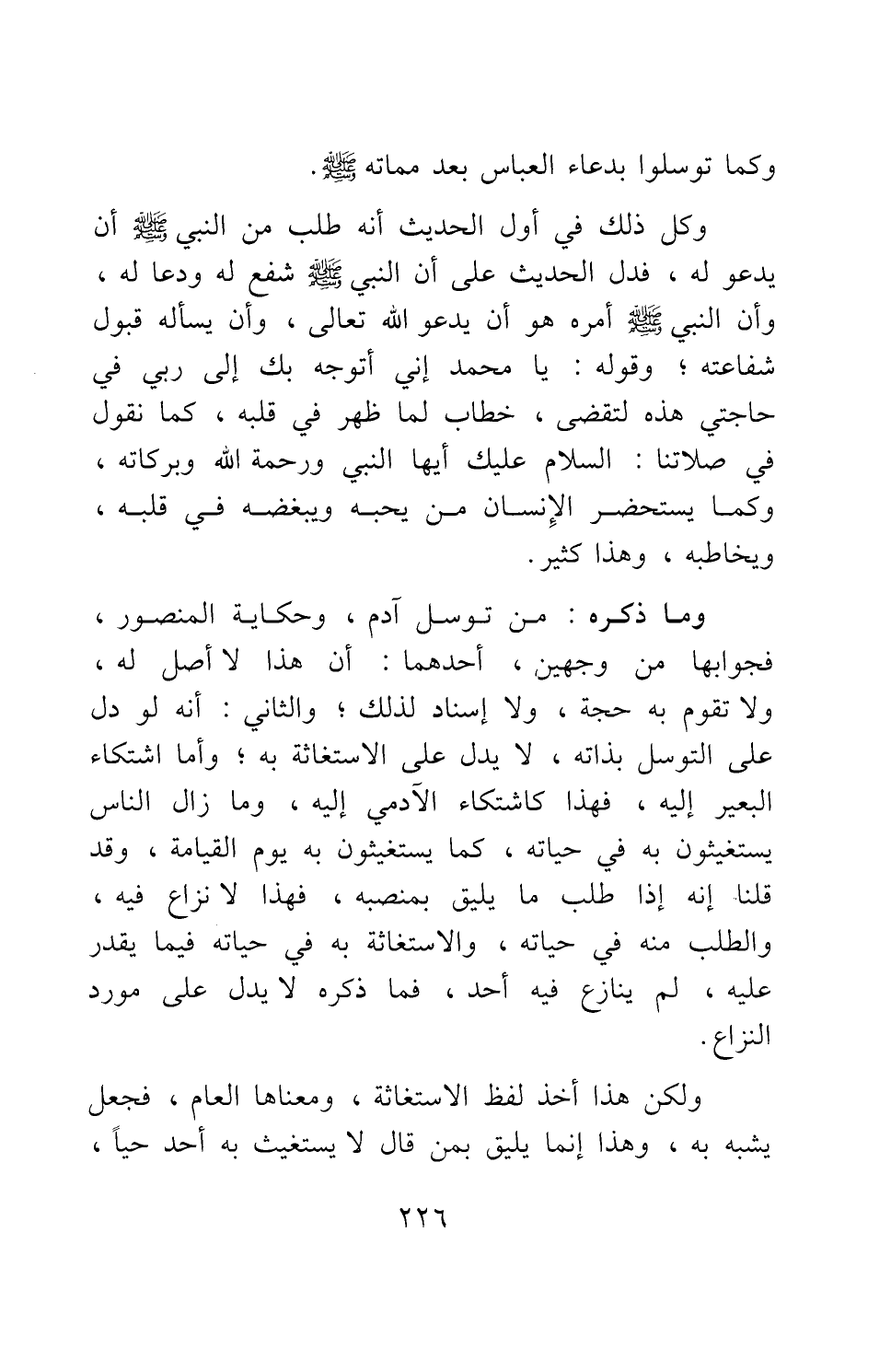 وما ذكره من توسل آدم وحكاية المنصور، فجوابها من وجهين: أحدهما: أن هذا لا أصل له، ولا تقوم به حجة، ولا إسناد لذلك. والثاني: أنه لو دل على التوسل بذاته، لا يدل على الاستغاثة به. وأما اشتكاء البعير إليه، فهذا كاشتكاء الآدمي إليه، وما زال الناس يستغيثون به في حياته، كما يستغيثون به يوم القيامة؛ وقد قلنا إنه إذا طلب ما يليق بمنصبه، فهذا لا نزاع فيه؛ والطلب منه في حياته، والاستغاثة به في حياته فيما يقدر عليه، لم ينازع فيه أحد. فما ذكره لا يدل على مورد النِّزاع.