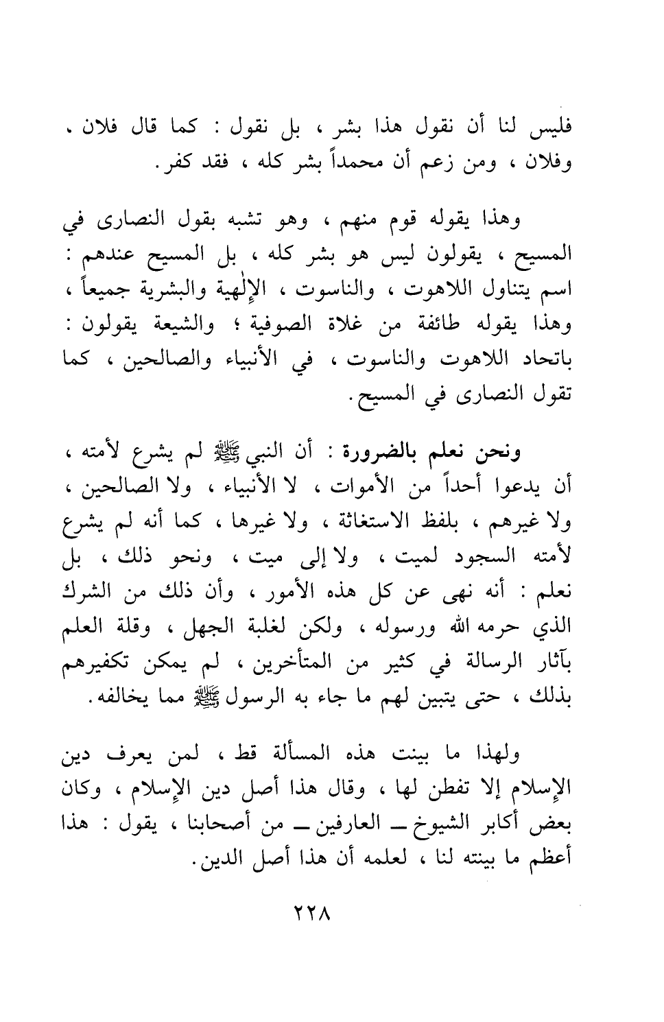 فليس لنا أن نقول: هذا بشر، بل نقول كما قال فلان وفلان، ومن زعم أن محمدا بشر كله، فقد كفر.