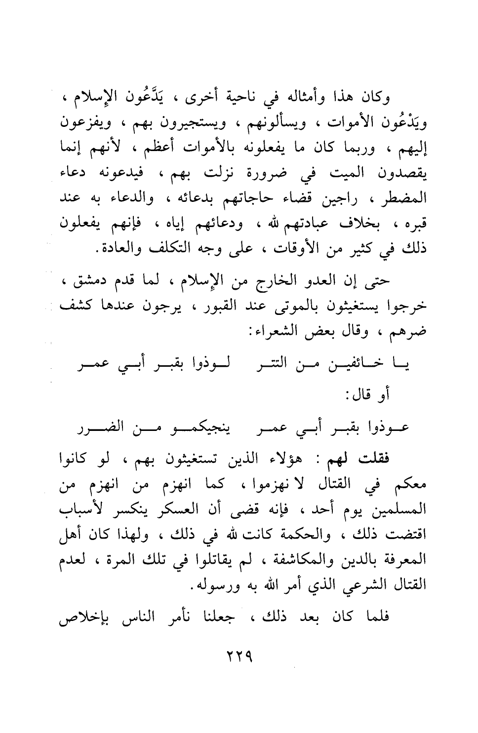 حتى إن العدو الخارج من الإسلام، لما قدم دمشق، خرجوا يستغيثون بالموتى عند القبور، يرجون عندها كشف ضرهم، وقال بعض الشعراء: