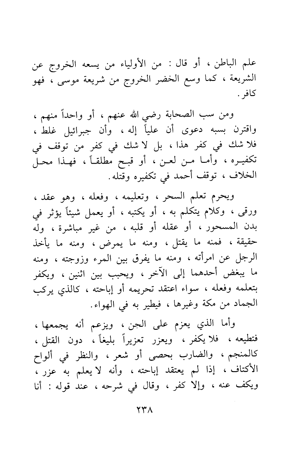 علم الباطن، أو قال: من الأولياء من يسعه الخروج عن الشريعة، كما وسع الخضر الخروج من شريعة موسى، فهو كافر.