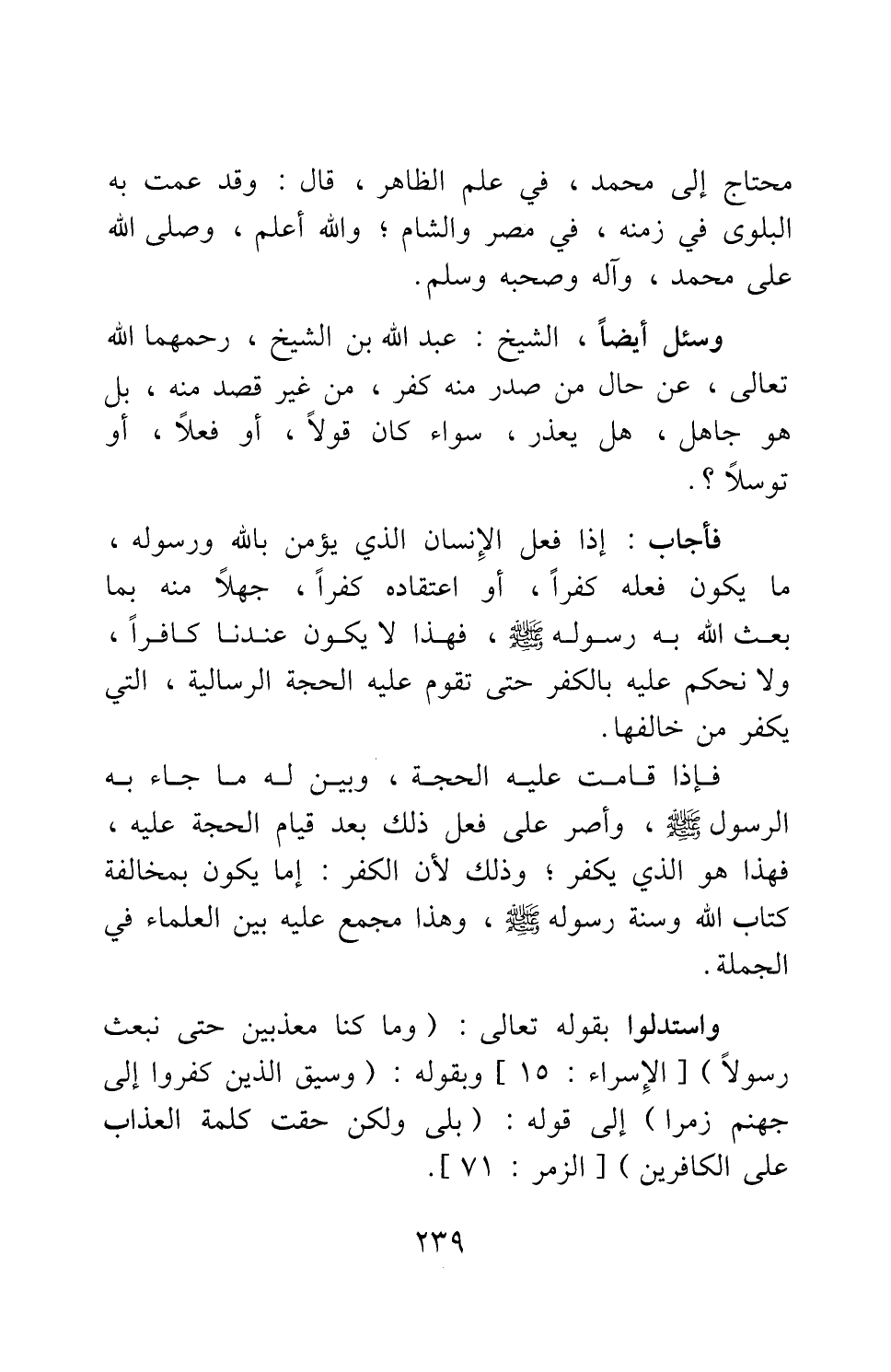 وسئل أيضا، الشيخ عبد الله بن الشيخ، رحمهما الله تعالى، عن حال من صدر منه كفر من غير قصد منه بل هو جاهل، هل يعذر، سواء كان قولا، أو فعلا، أو توسلا؟