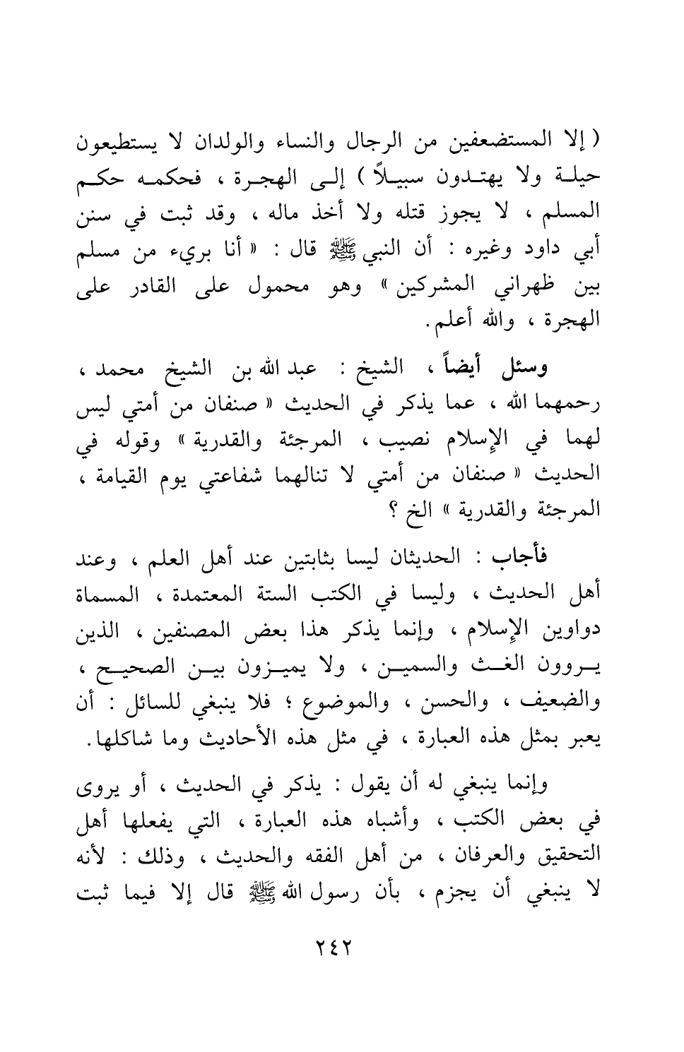 وسئل أيضا، الشيخ عبد الله بن الشيخ محمد، رحمهما الله، عما يذكر في الحديث: "صنفان من أمتي ليس لهما في الإسلام نصيب: المرجئة والقدرية"، وقوله في الحديث: "صنفان من أمتي لا تنالهما شفاعتي يوم القيامة: المرجئة والقدرية" الخ؟